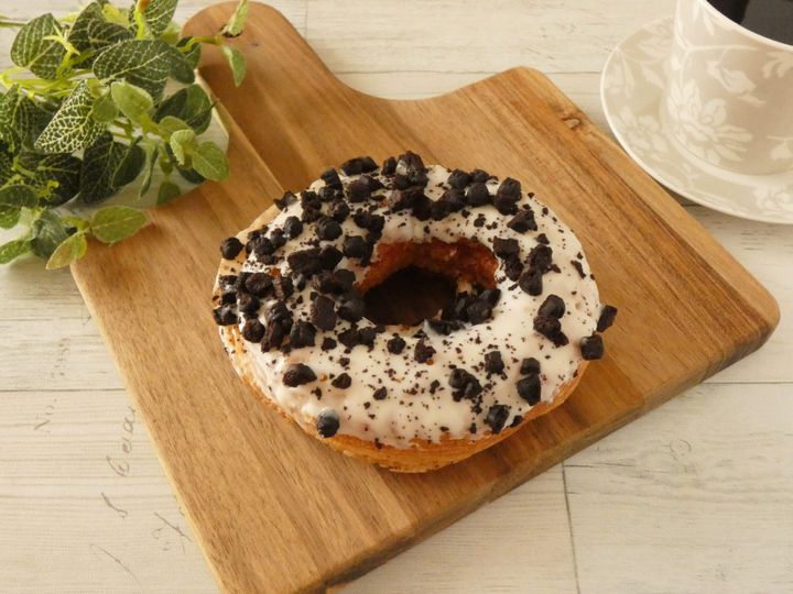 クロワッサン生地のドーナツにクッキークリーム入り。ホワイトチョコがコーティングしてあり、上にはココアクッキークランチがトッピングしてあります。