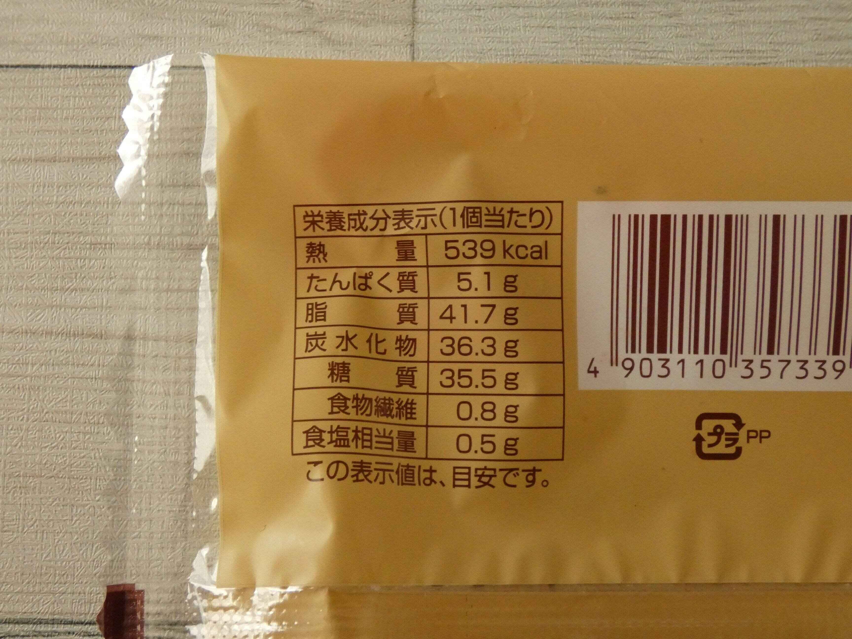 栄養成分表示を見ると1個のエネルギーは539kcal。クロワッサン生地なので高めだと思っていましたが、あまりのハイカロリーにビックリ!