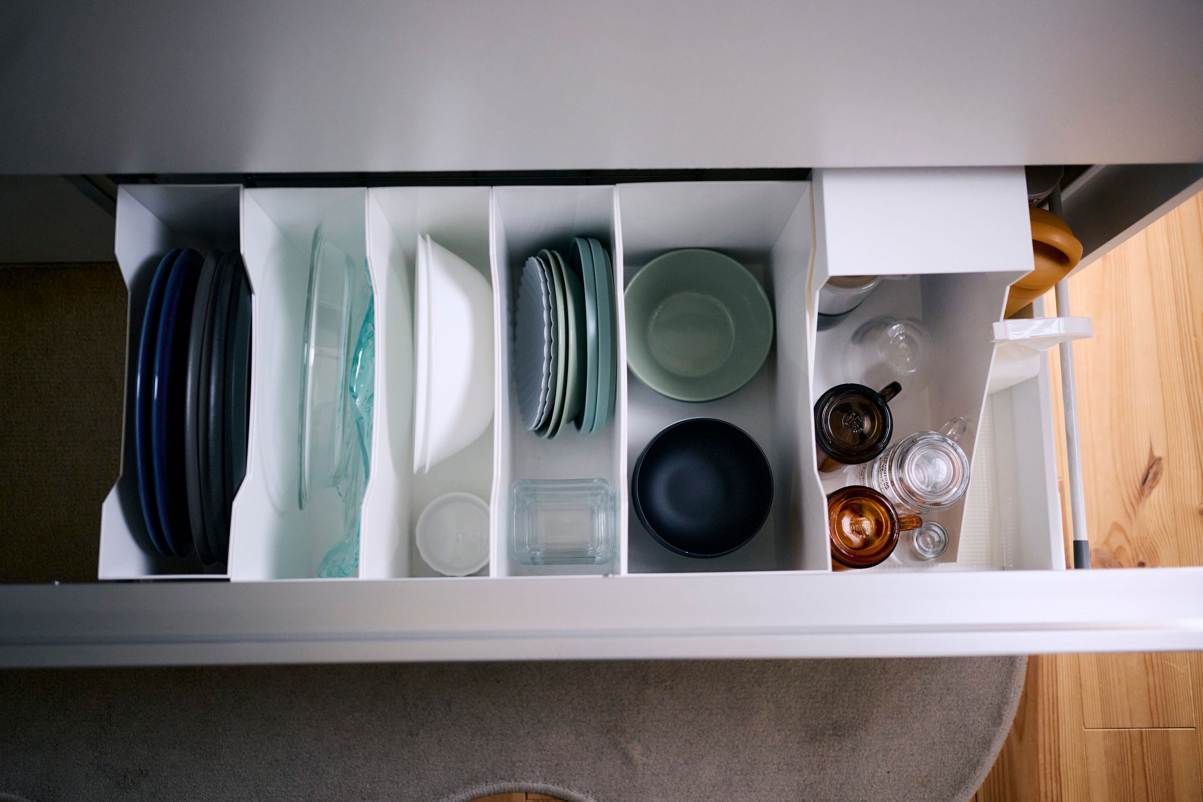 シンク下の棚は、一軍の食器入れ。ニトリのファイルボックスを使用し、食器類を立てて収納することで出し入れがラクに!