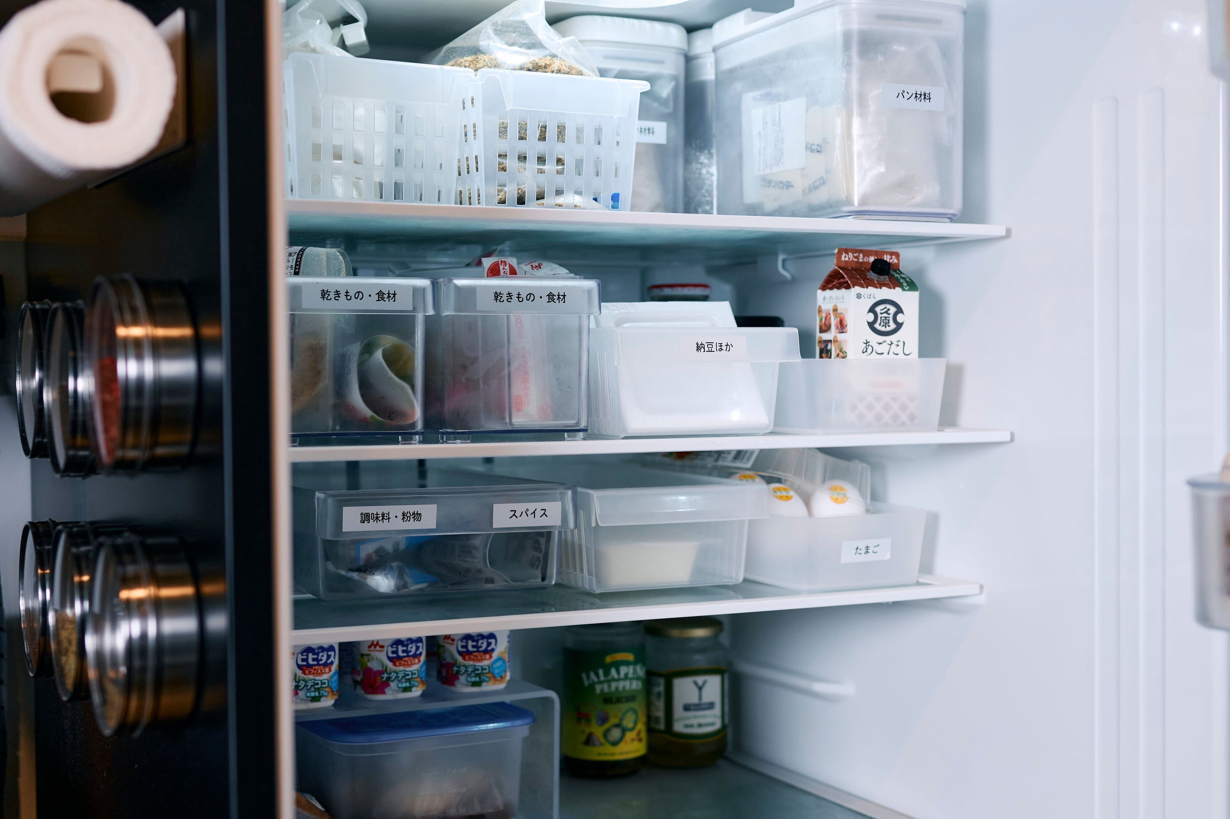 小分けにしてラベリングする最初のひと手間が、その後のストレスを防ぐのかもしれません。「すべての収納に言えることですが、詰め込みすぎないことがポイント。7割収納をめざし、余白をつくることで、食品ロスがなくなります」