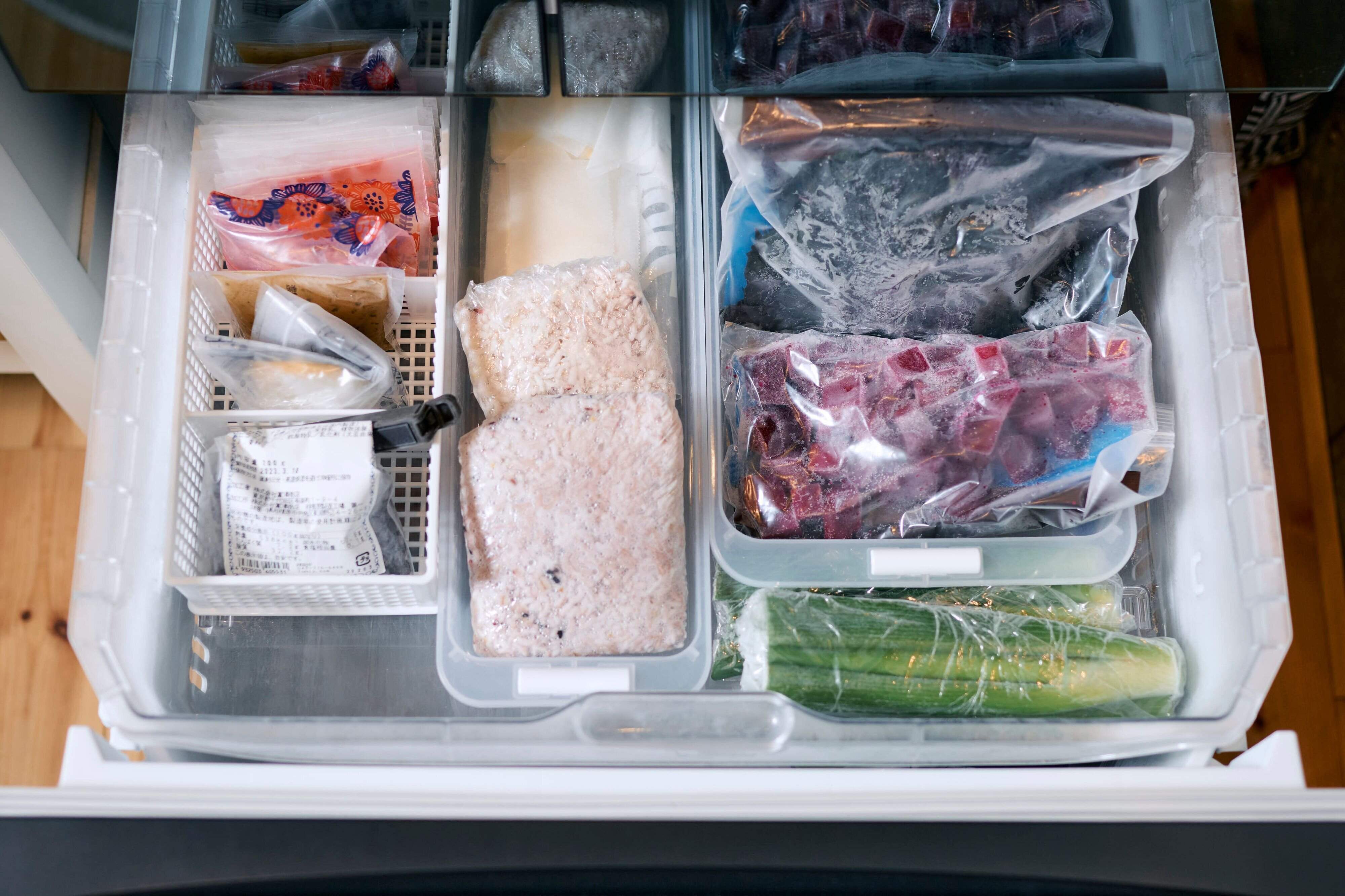 冷凍室は収納ケースで区切ってジャンル分け。立ててしまえば、死蔵品はなし。