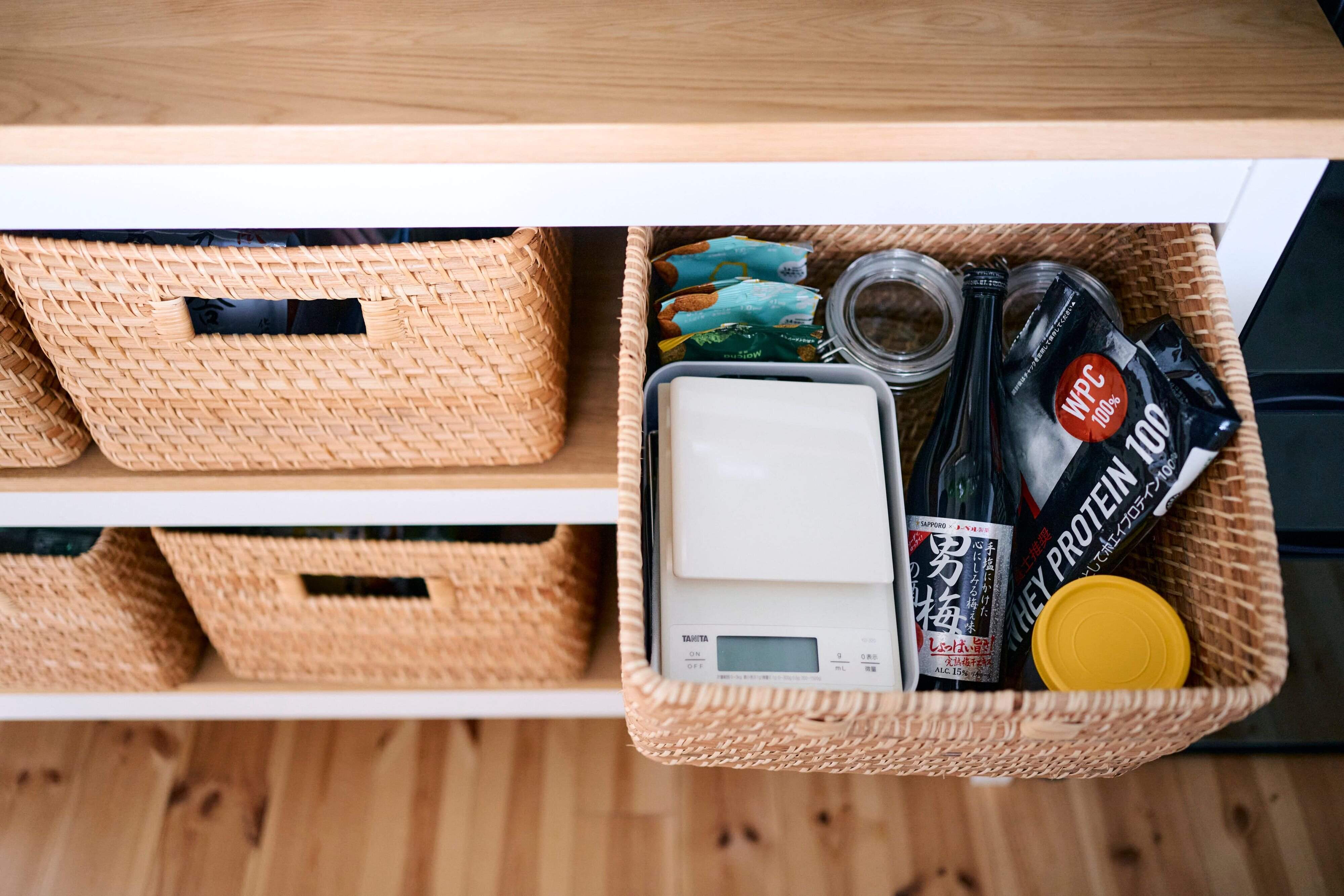 「取りやすい上段は使用頻度が高いもの、下段は使用頻度が低いものを入れています。3アクション以上になる途端に面倒に感じるので、かごを引き出して取る!の2アクションになるように考えています。
