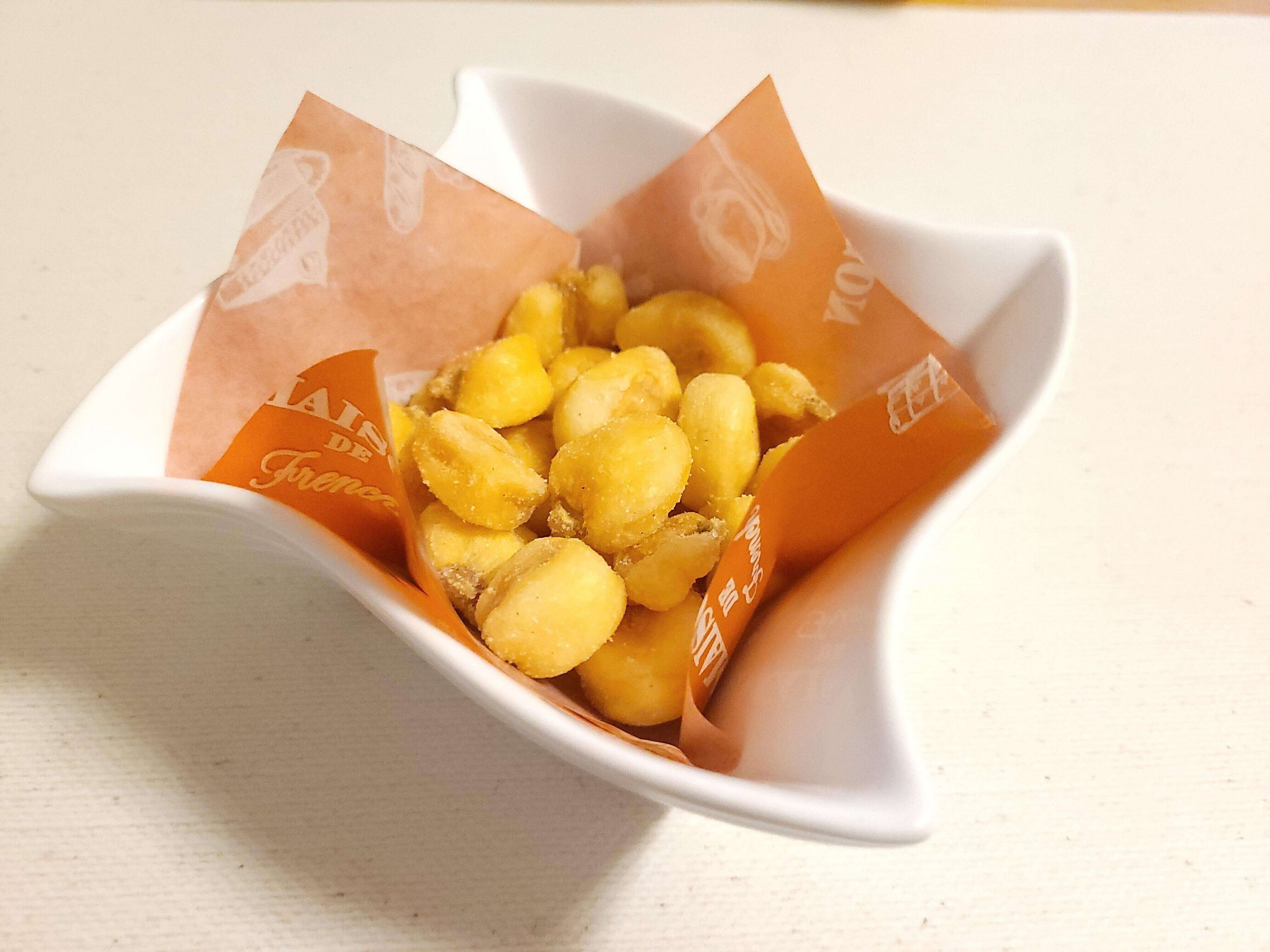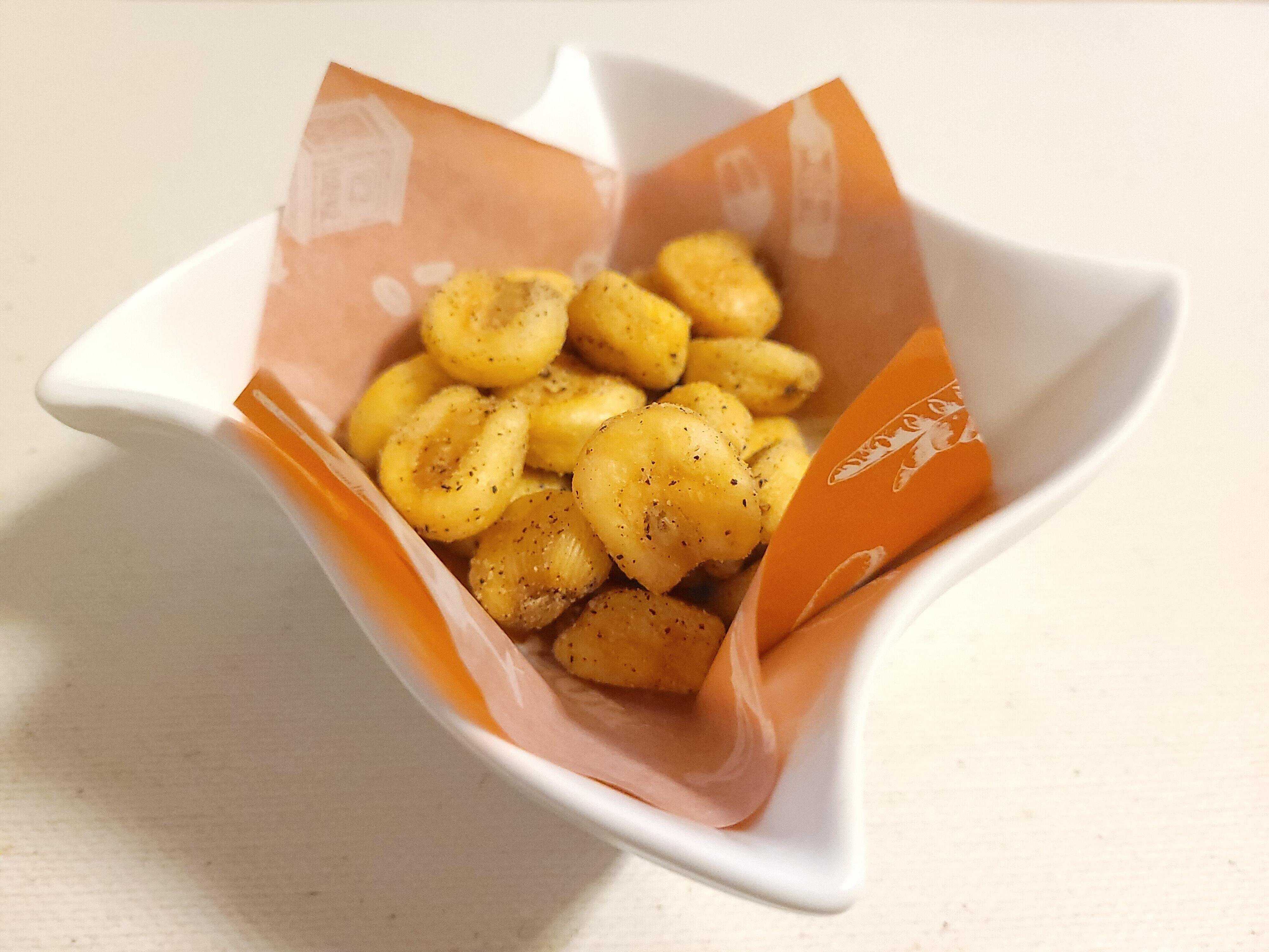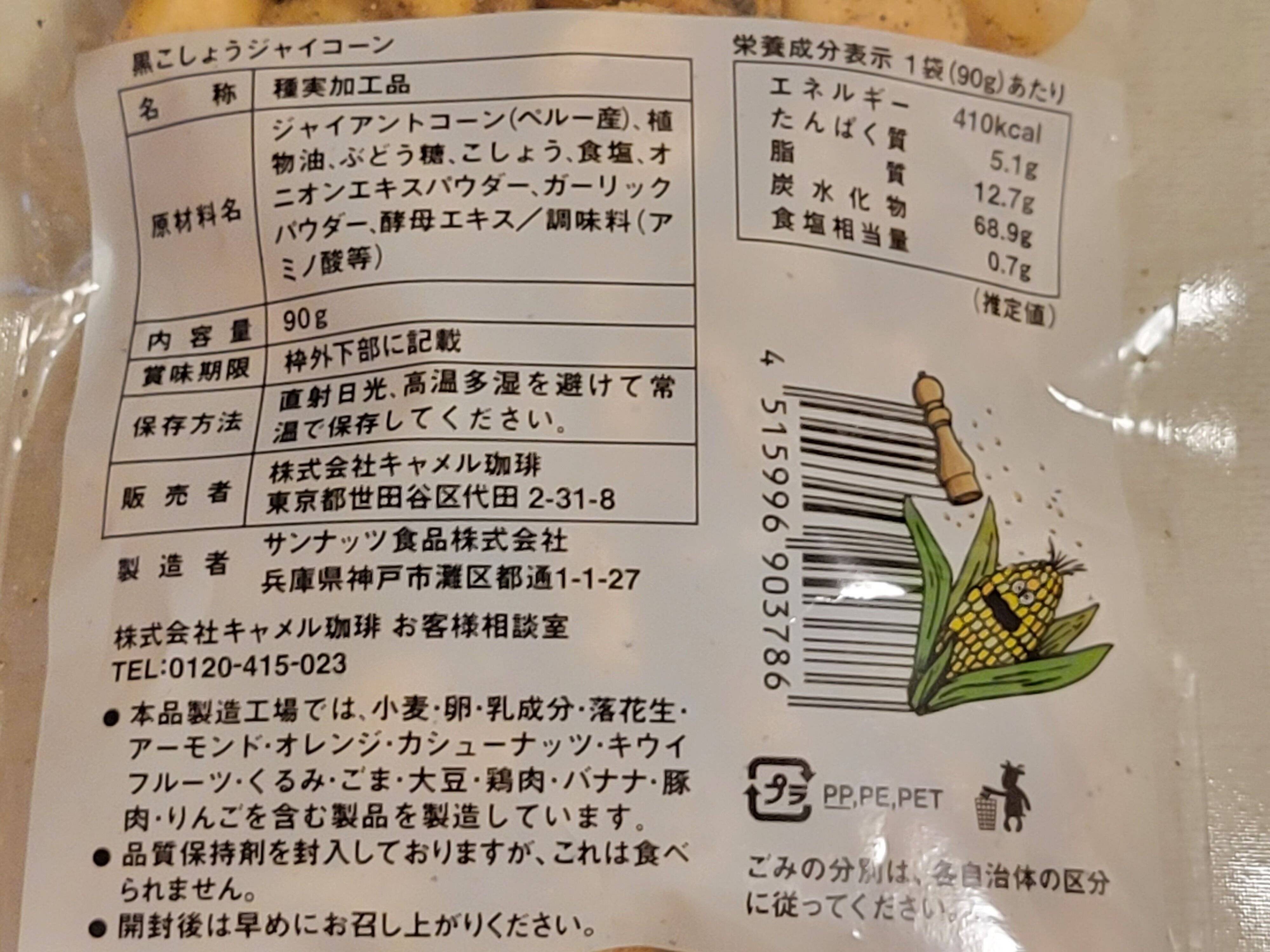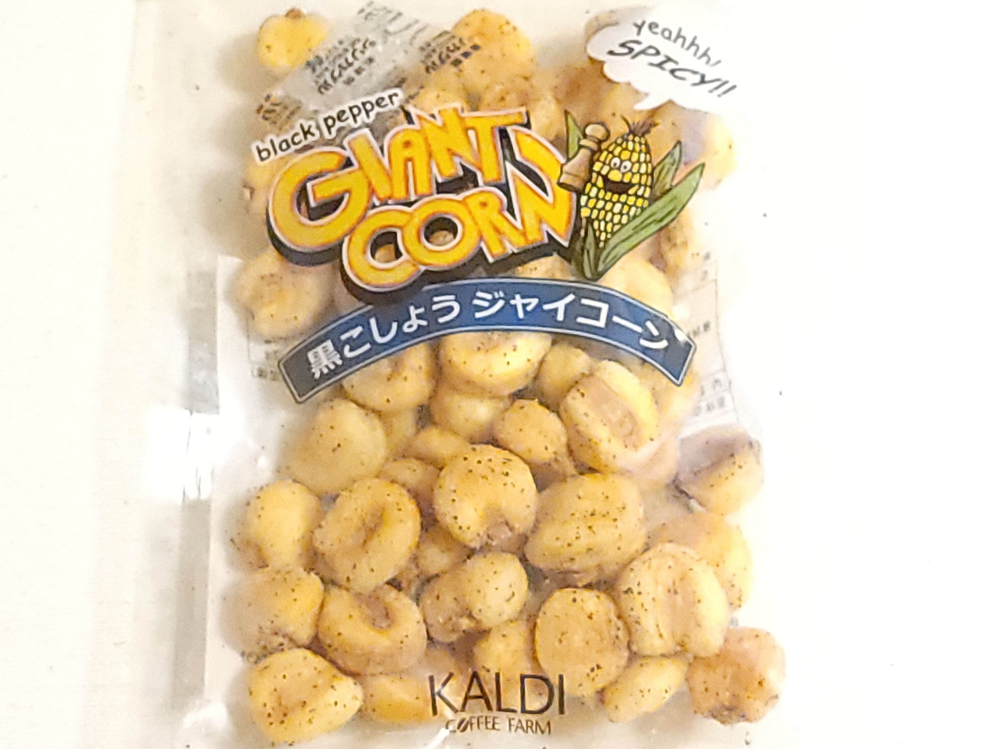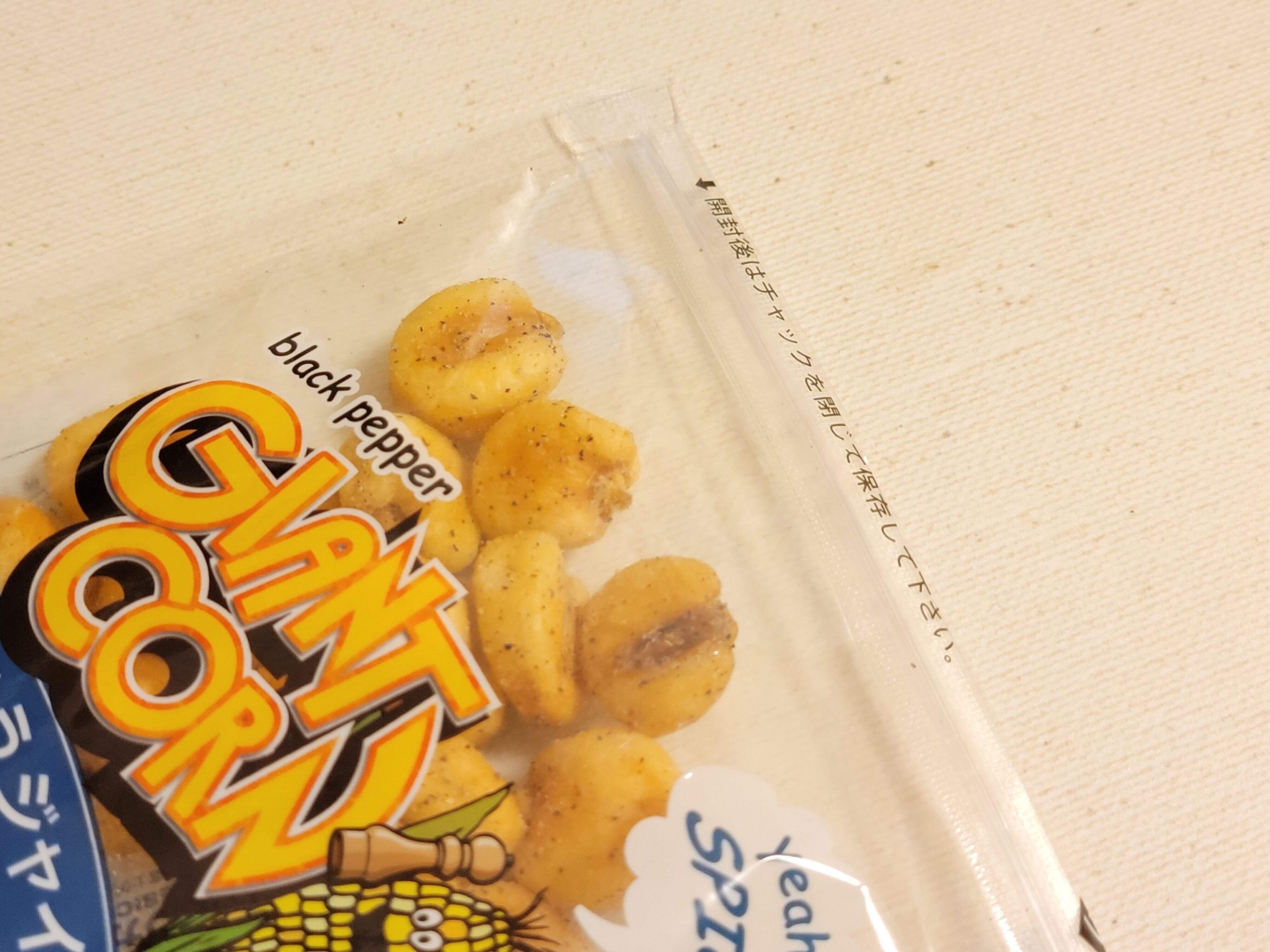 ジャイアントコーンをこしょうや食塩、オニオンエキスパウダー、ガーリックパウダーなどで味付けしている商品です。