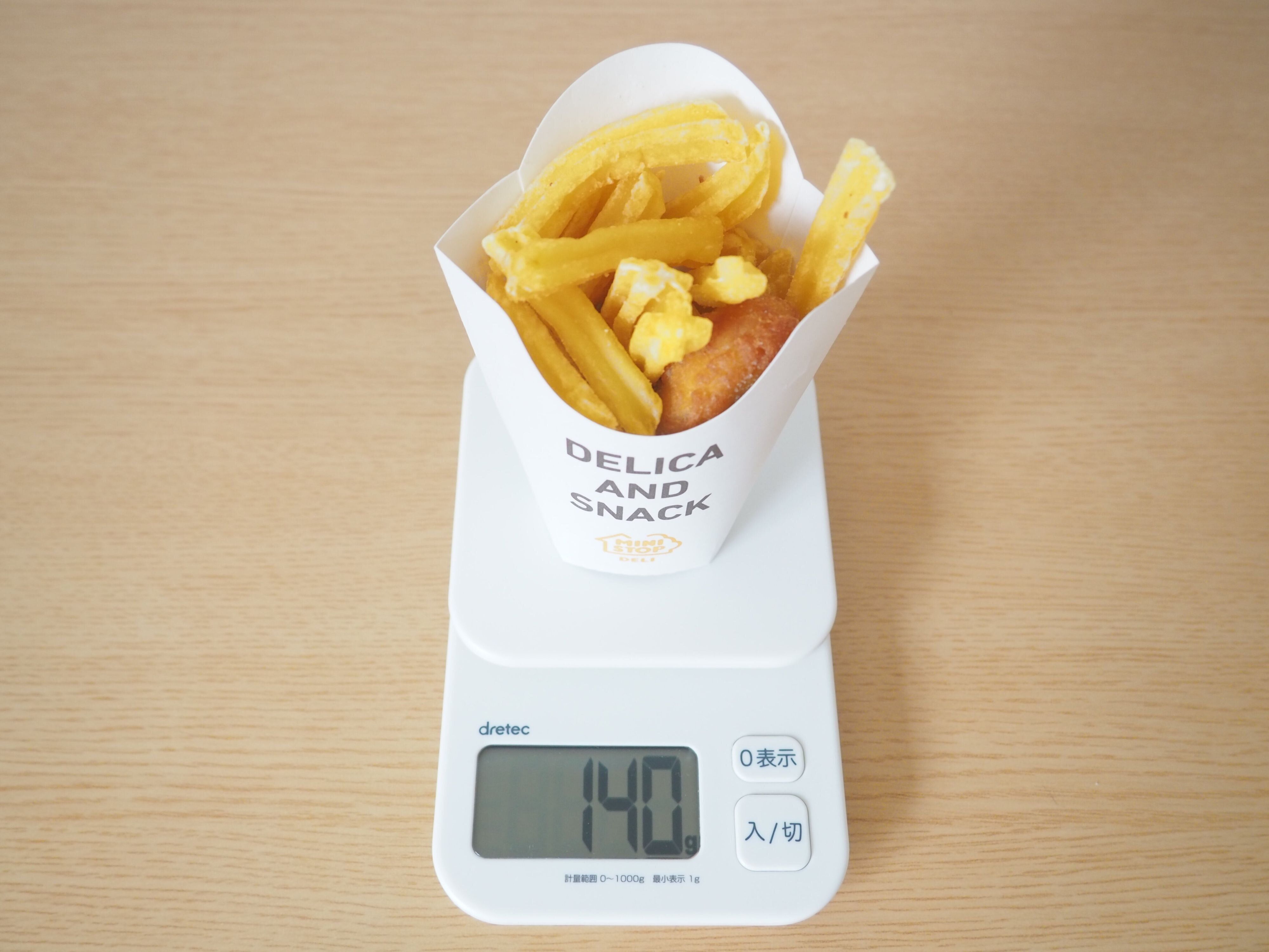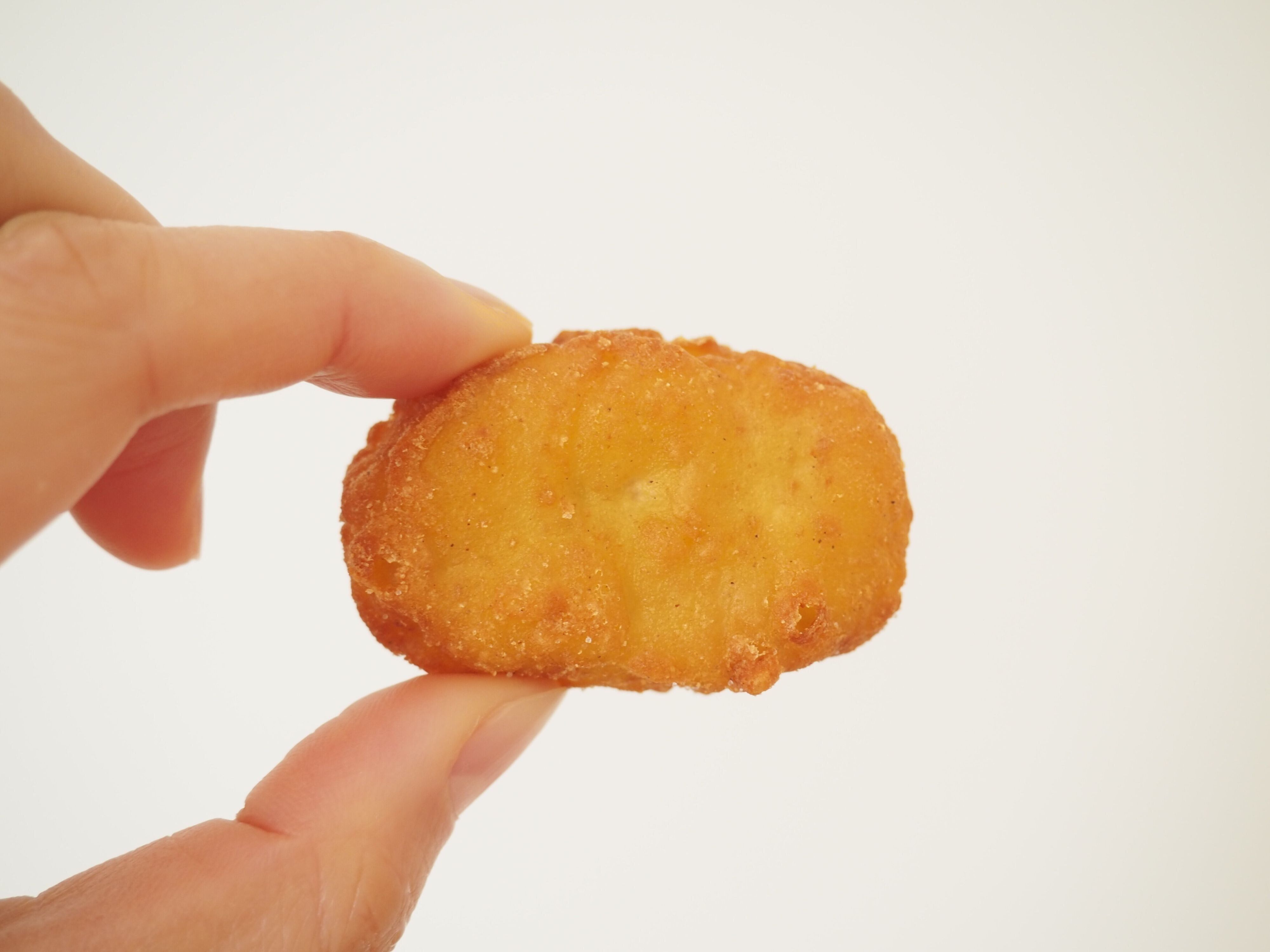 チキンナゲットは親指と人差し指でつまめるサイズ。3個入っていて、1個あたりはすべて20gでした。