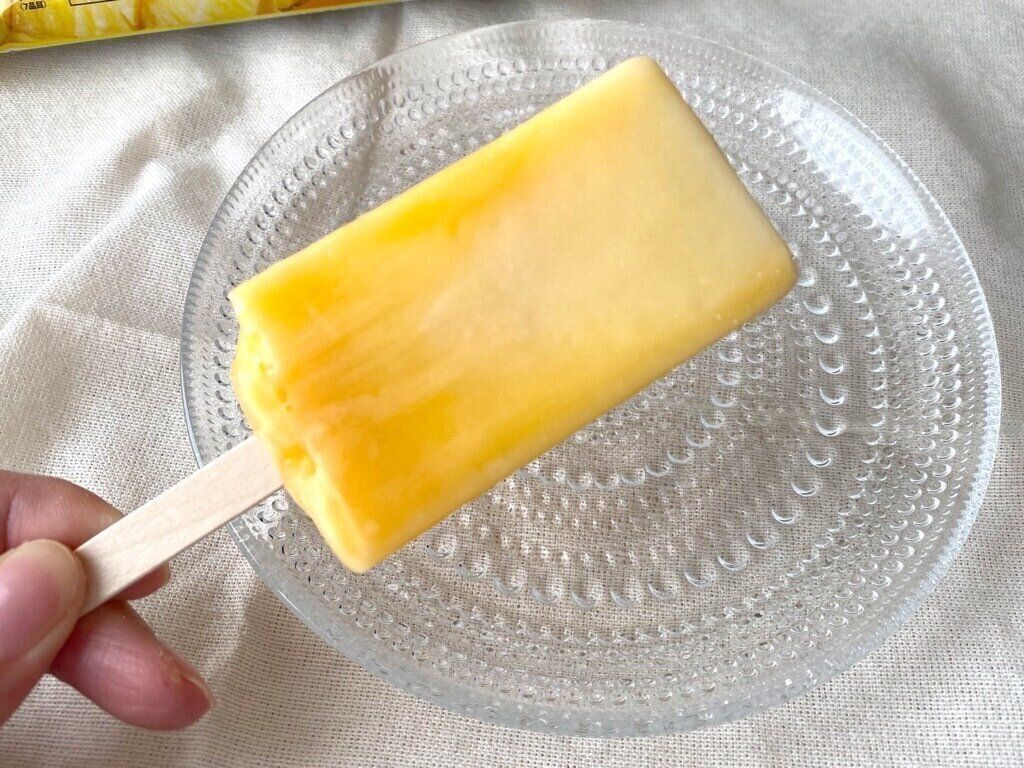 沖縄県産パイン果汁とピューレを使用したアイスバーです。完熟した甘みの強い層と、爽やかでサッパリした味わいの層をマーブル状にした2層構造になっています。