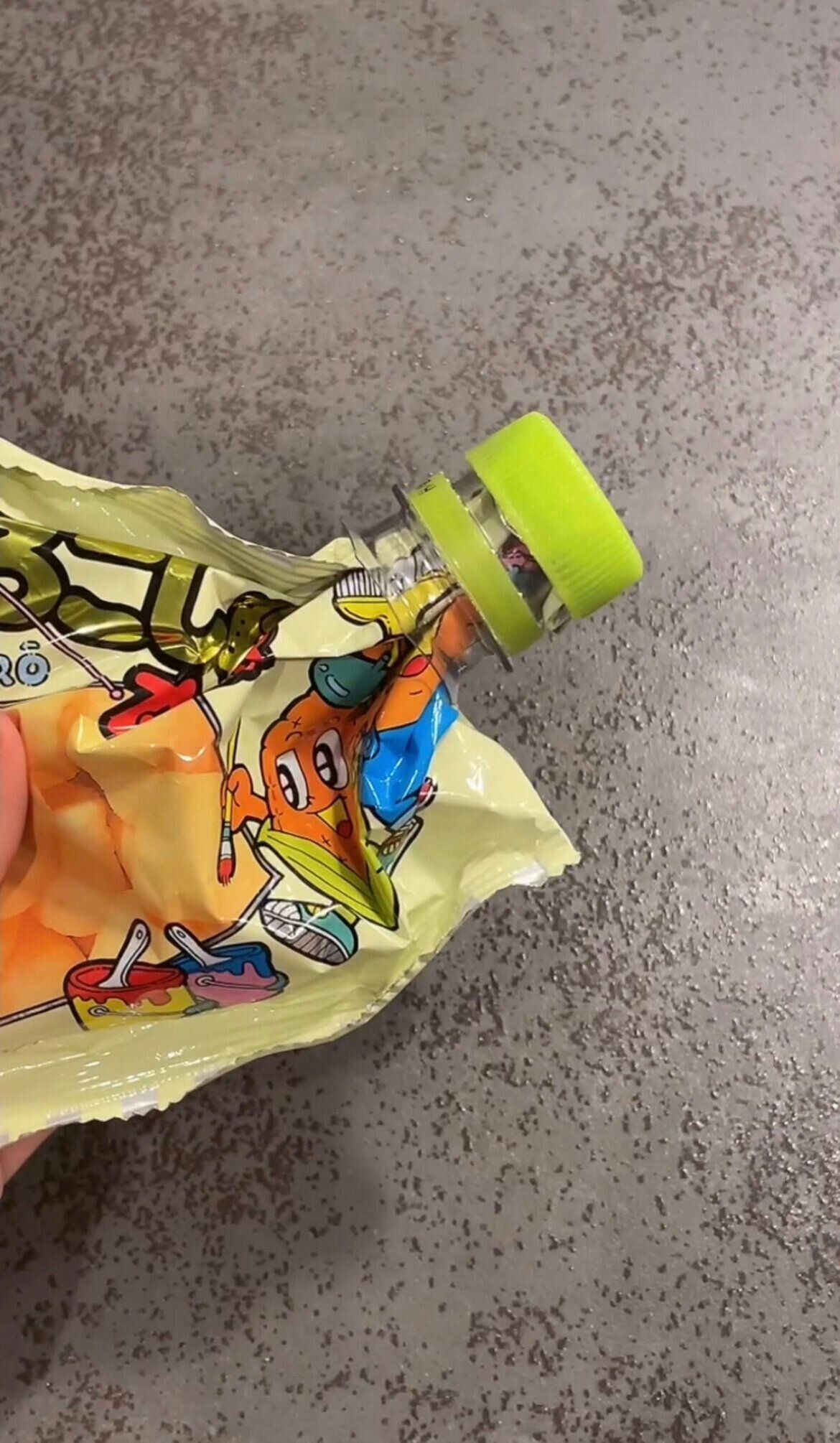 ペットボトルの上部をカットし、お菓子の袋に取りつけてからキャップを閉めれば密閉容器に早変わり♪
