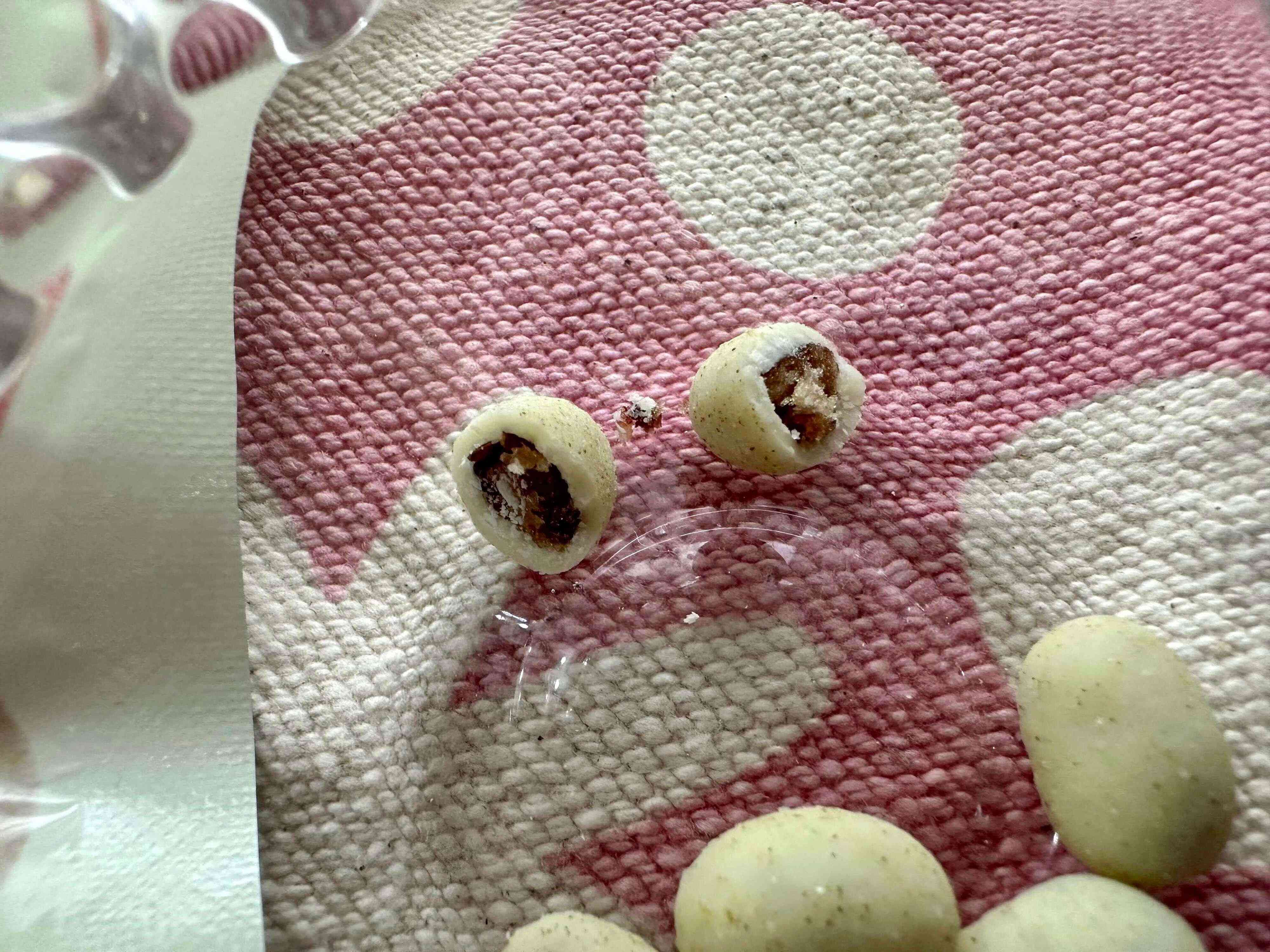 半分に割ってみると「あずきの甘納豆」の周りにはたっぷりの「ホワイトチョコレート」がしっかりコーティングされているのがわかります。さらにホワイトチョコの周りには「桜葉パウダー」が。