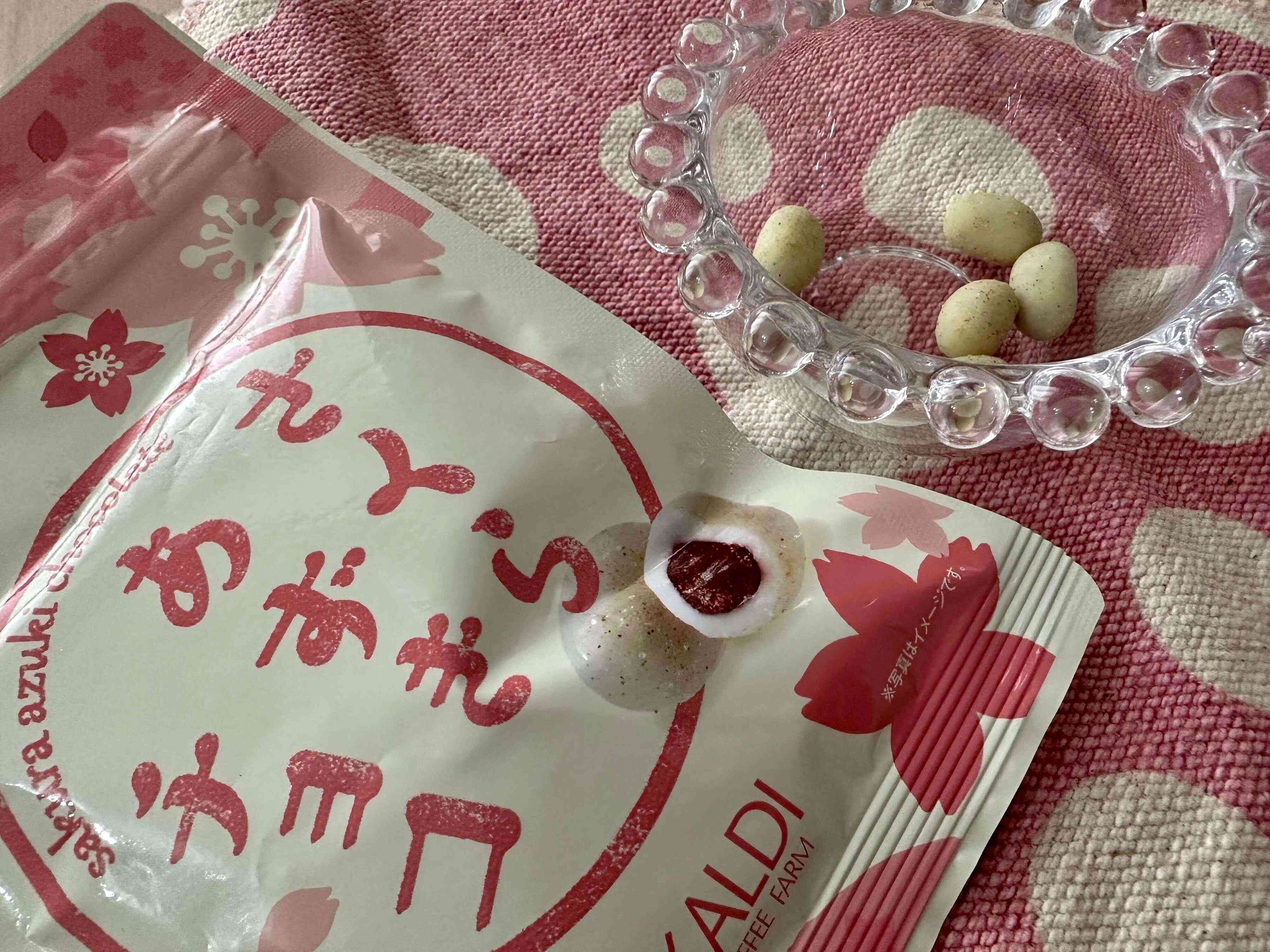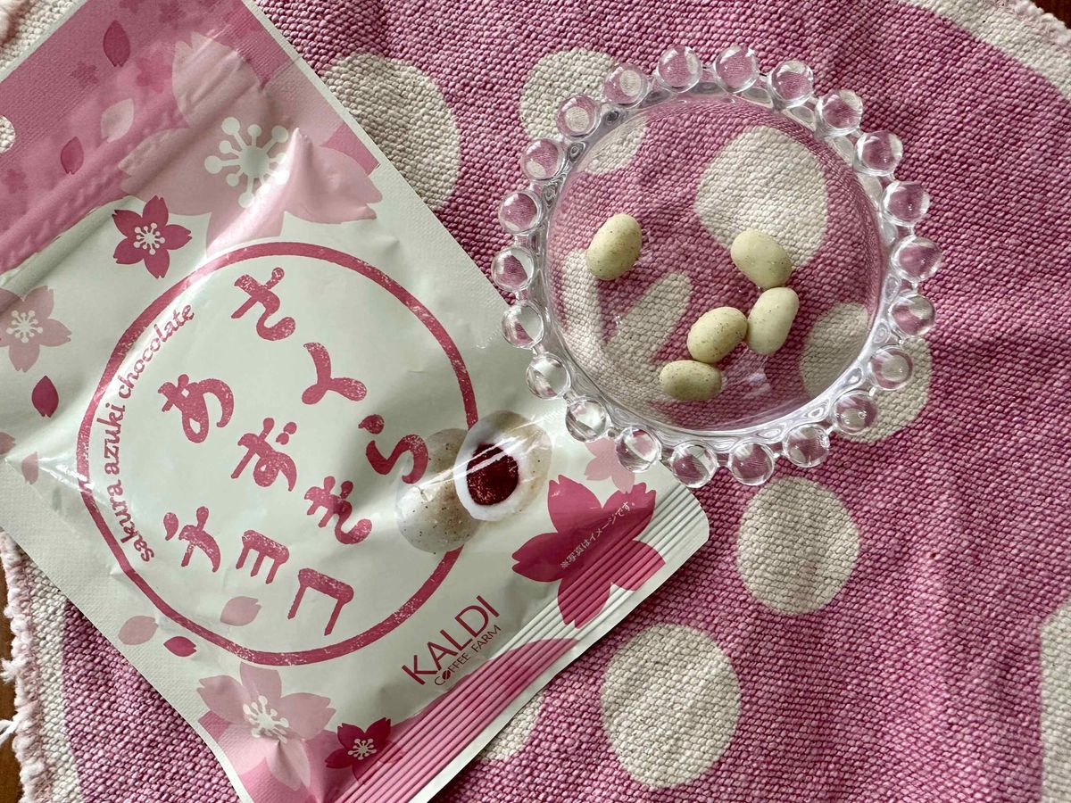この時期だけの桜フレーバーの商品は見ているだけでもワクワク。限定に目がない筆者、ついついたくさん買いすぎてしまいました。中でも今回は、カルディオリジナルの「さくらあずきチョコ」をご紹介します。