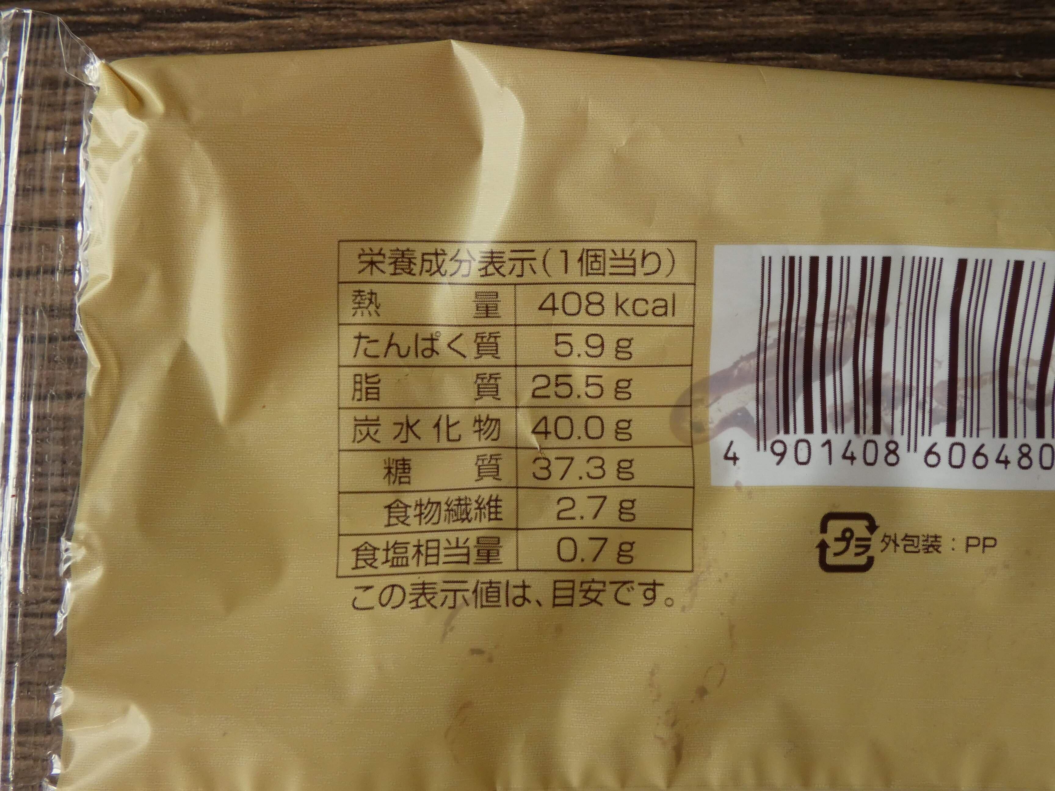 栄養成分表示を見ると1個のエネルギーは408kcal。デニッシュ生地にチョコレートたっぷりなのでカロリーはちょっと高めです。