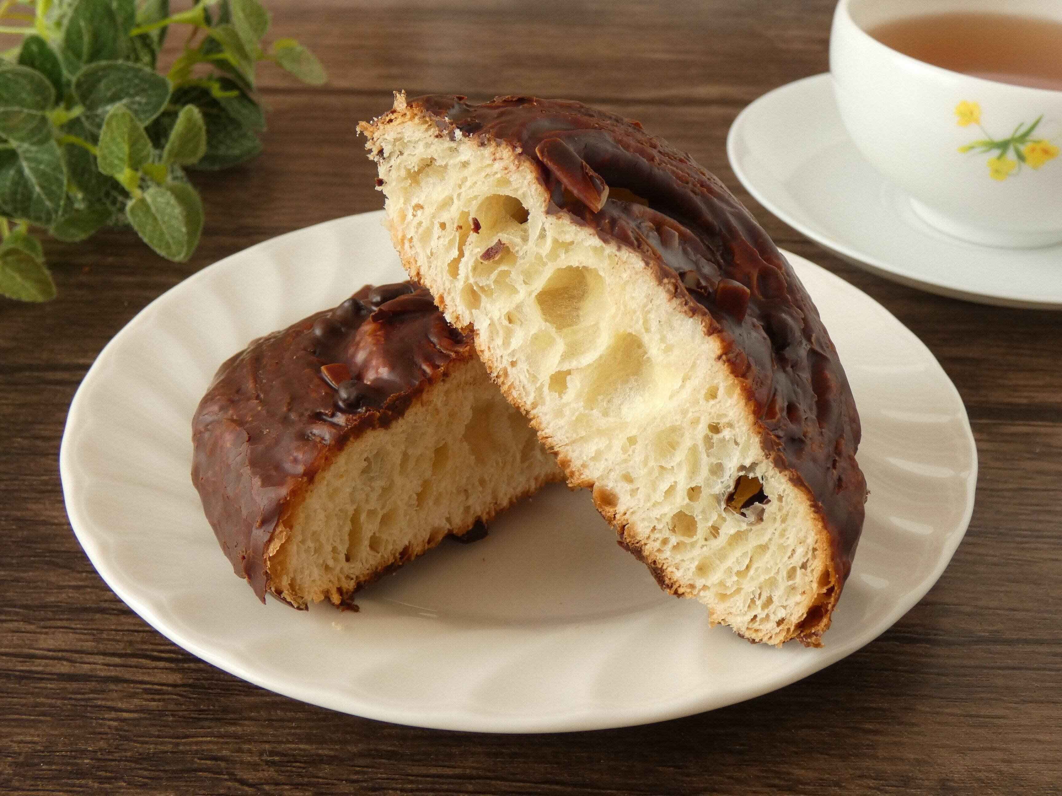 カットするとトッピングしてあるアーモンドがザクザクして、デニッシュ生地のところどころにブロック状のチョコレートが見えます。ひとくち食べるとチョコレートの甘さと香りが広がってアーモンドの食感が楽しい!ほんのりした塩気と歯ごたえがアクセントになっています。ボリュームたっぷりで食べ応えあり。大満足のスイーツパンはチョコ好きにオススメなので、ぜひお試しください。