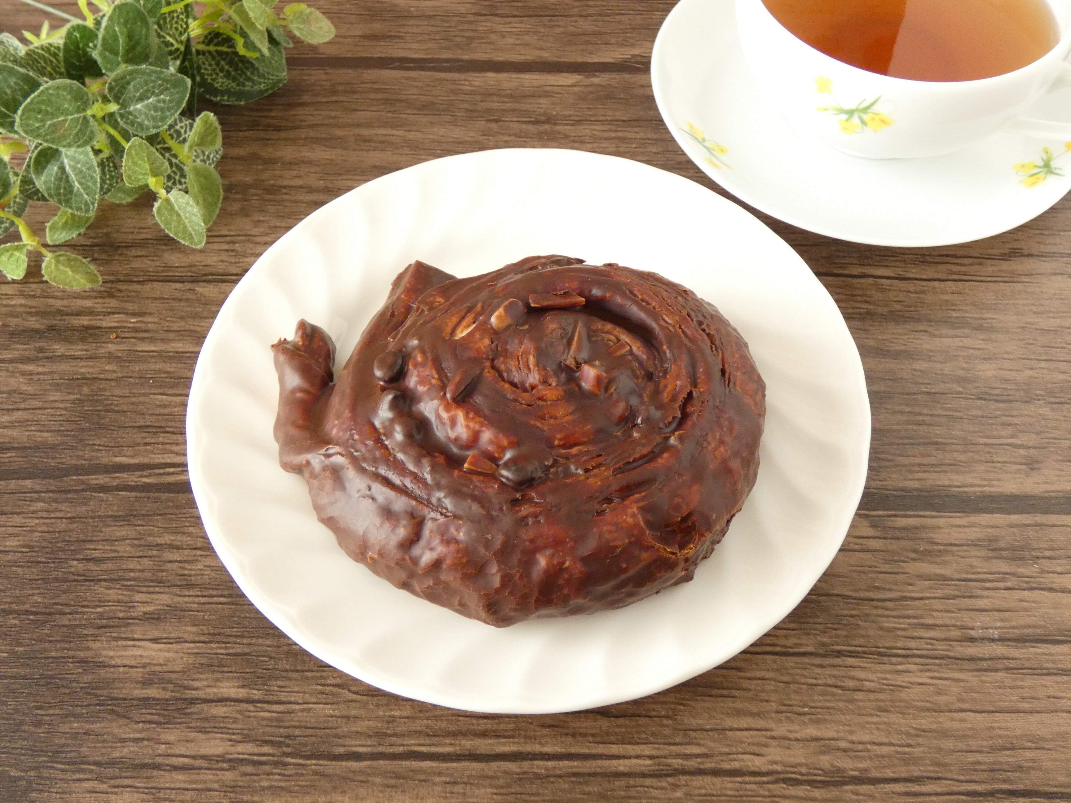 チョコを巻き込んだデニッシュ生地にアーモンドが乗せてあり、チョココーティングしてあります。