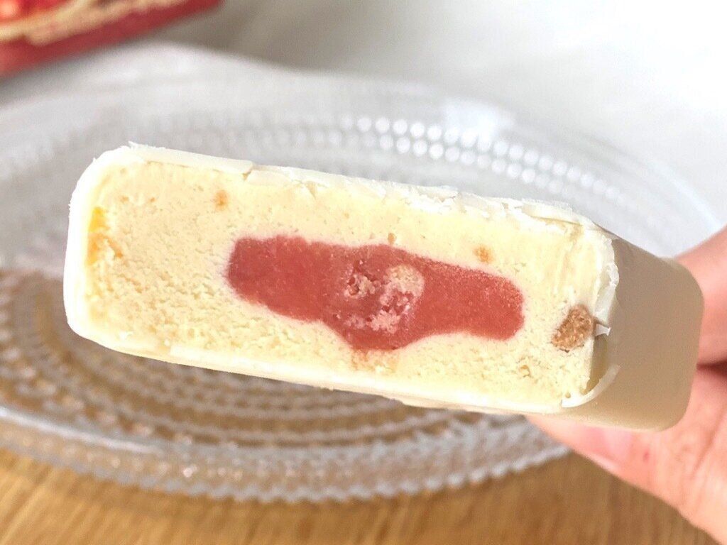 バター風味クッキーを混ぜ込んだカスタードアイスをホワイトチョコレートでコーティング。中央にはいちご果肉ソースが入っています。