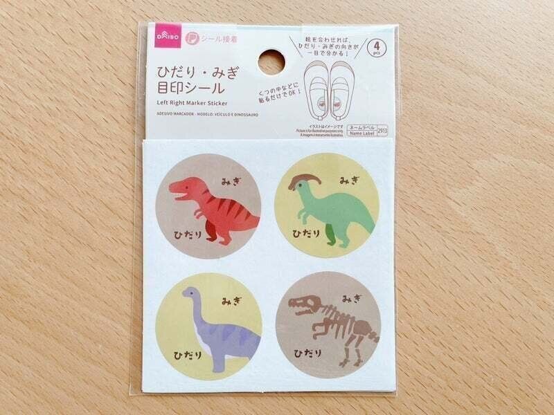 朝保育園に連れて行ったら手を洗って上靴を履いてお部屋に入るまでを見守るのですが、なぜか上靴の左右をひっくり返して履いてしまっていて声掛けすることが時々あります。そんな時にお役立ちなのがダイソーの「ひだり・みぎ目印シール」!まぁ~るいシールの中に恐竜の可愛いイラストが描かれていて、真ん中に切れ目があるので半分に切れたシールを右と左の上靴や靴の中に貼るだけです。