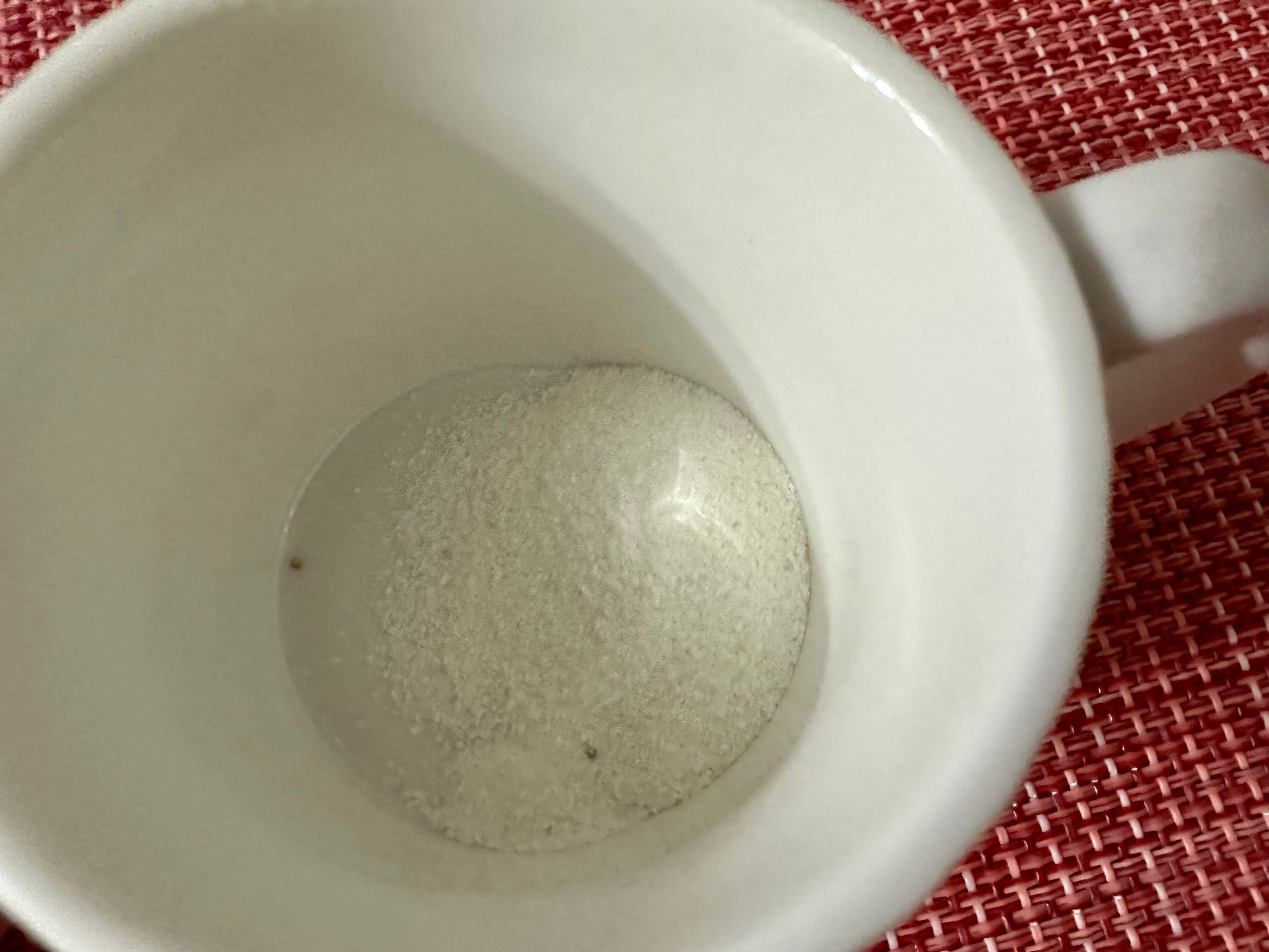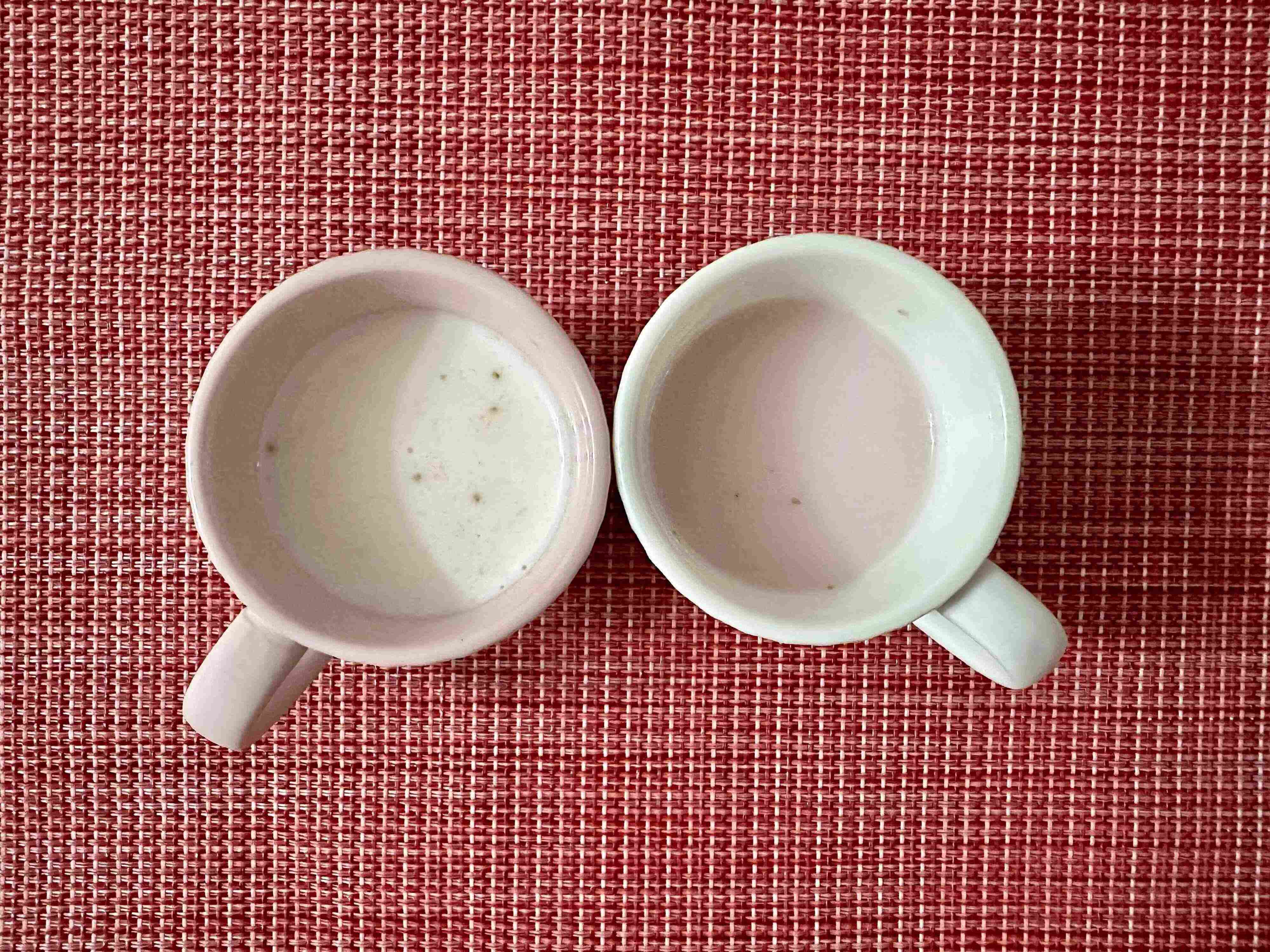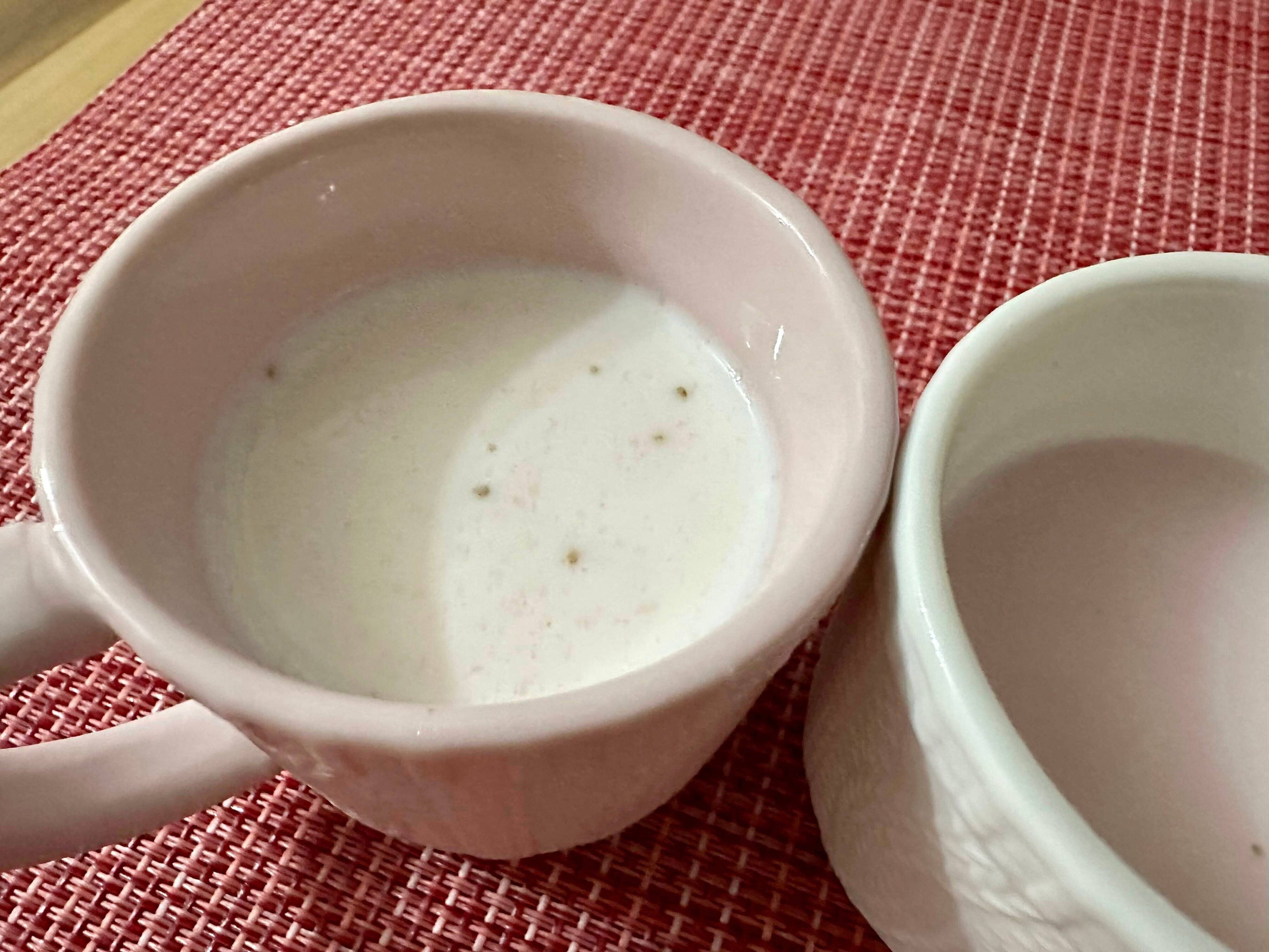 右側の白いマグがお湯、左側のピンクのマグがホットミルクで溶かしたものです。
