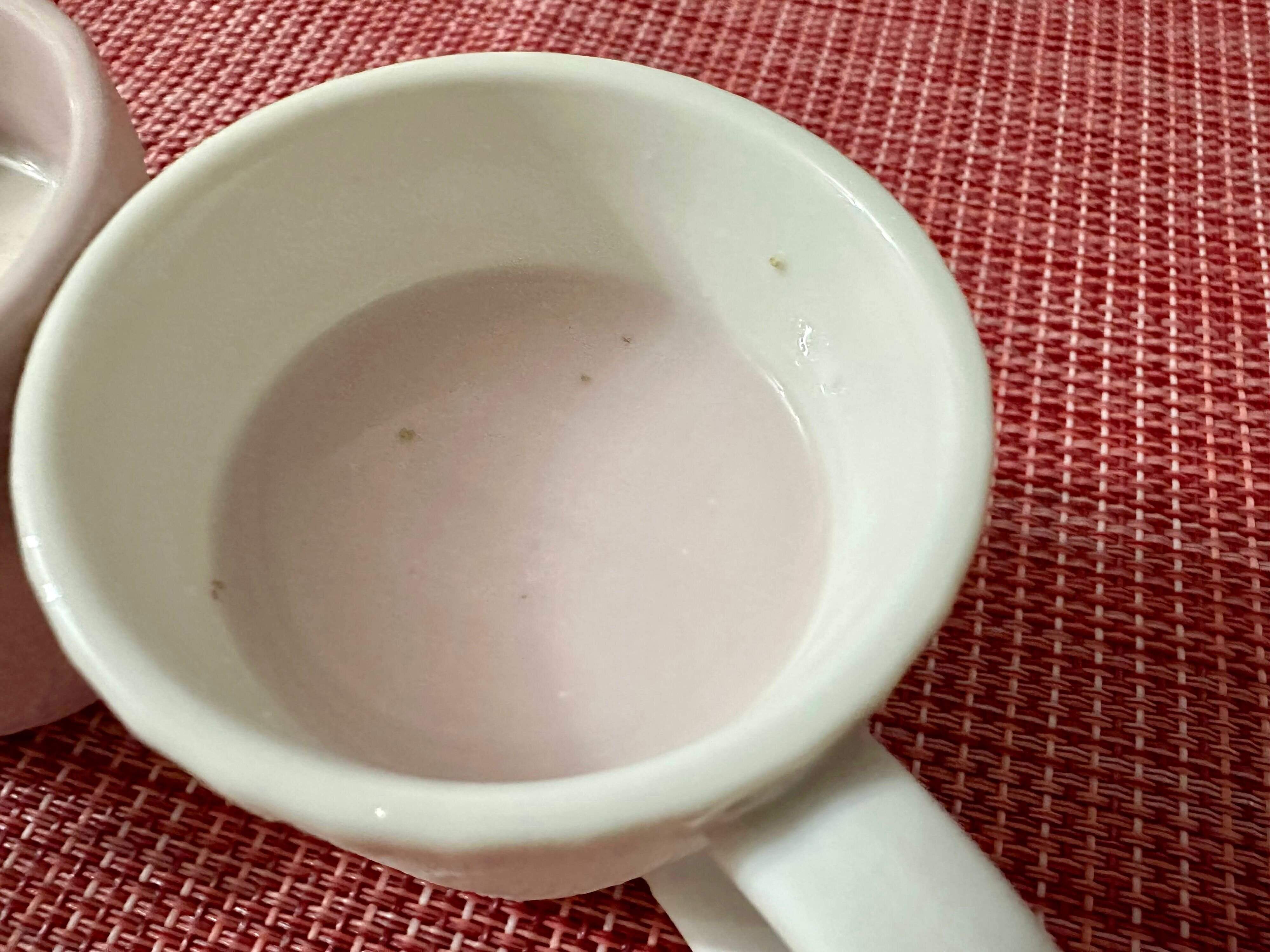 ホットミルクの方は牛乳の白色が目立ちますが、お湯で溶かした方は淡いピンク色が綺麗に発色していました。
