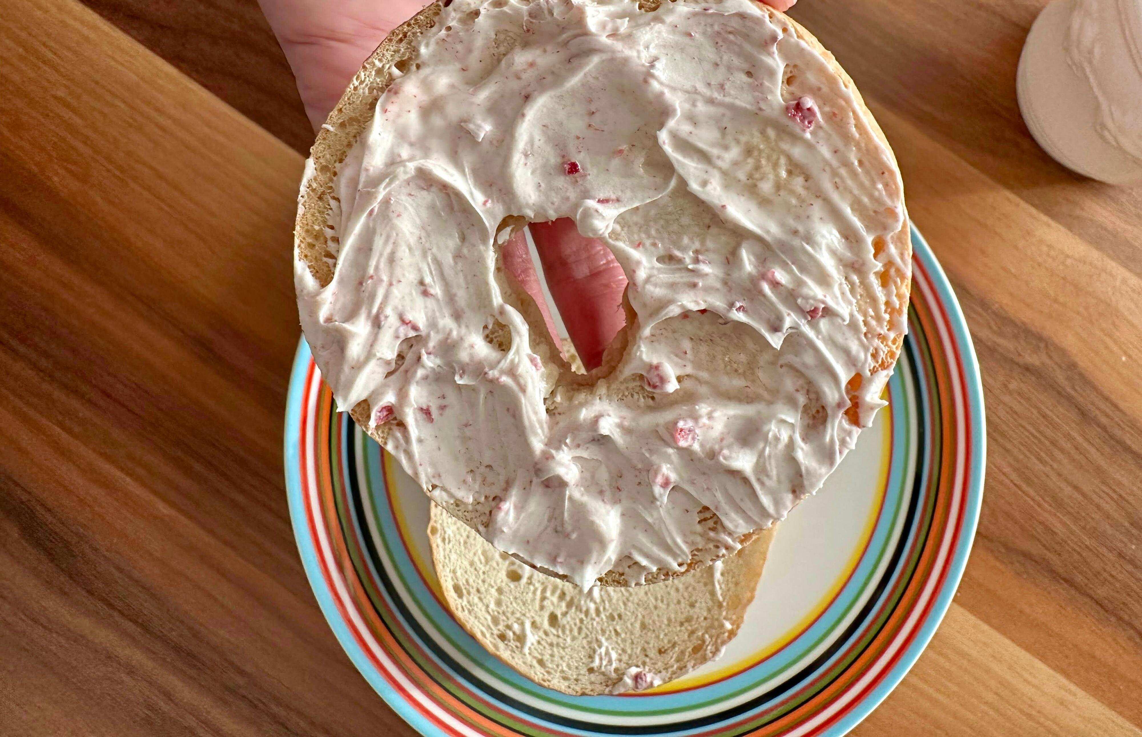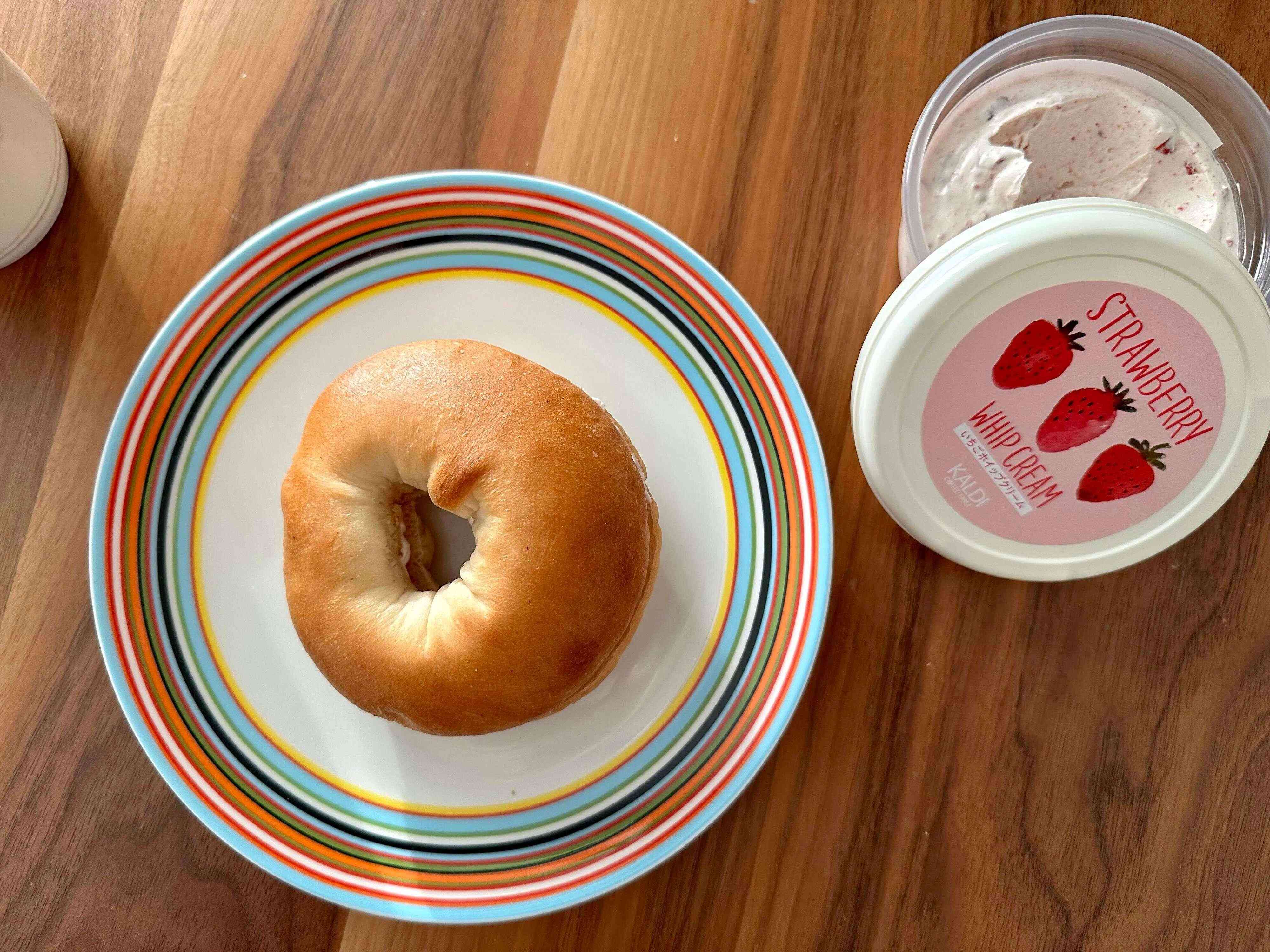 半分にスライスしたベーグルをトースターで軽く焼き、たっぷりといちごホイップを塗るとベーグルのサクサクもちもちとホイップのふわふわ食感が最高に美味でしたよ。