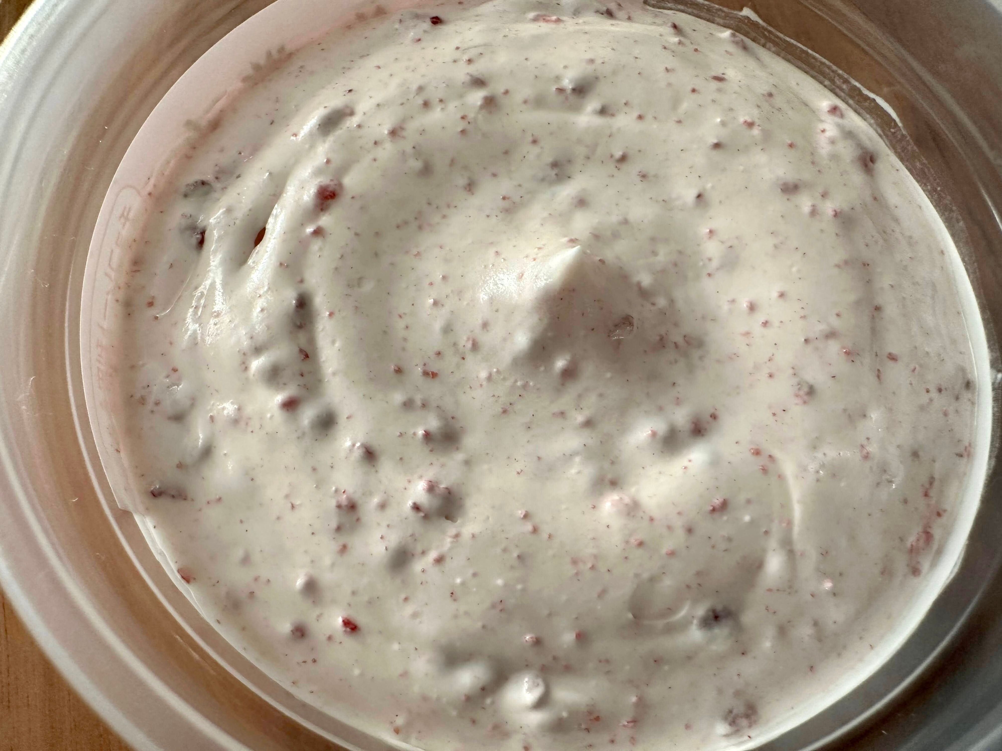 苺風味のホワイトチョコベースのクリームには、たっぷりのフリーズドライ苺が。