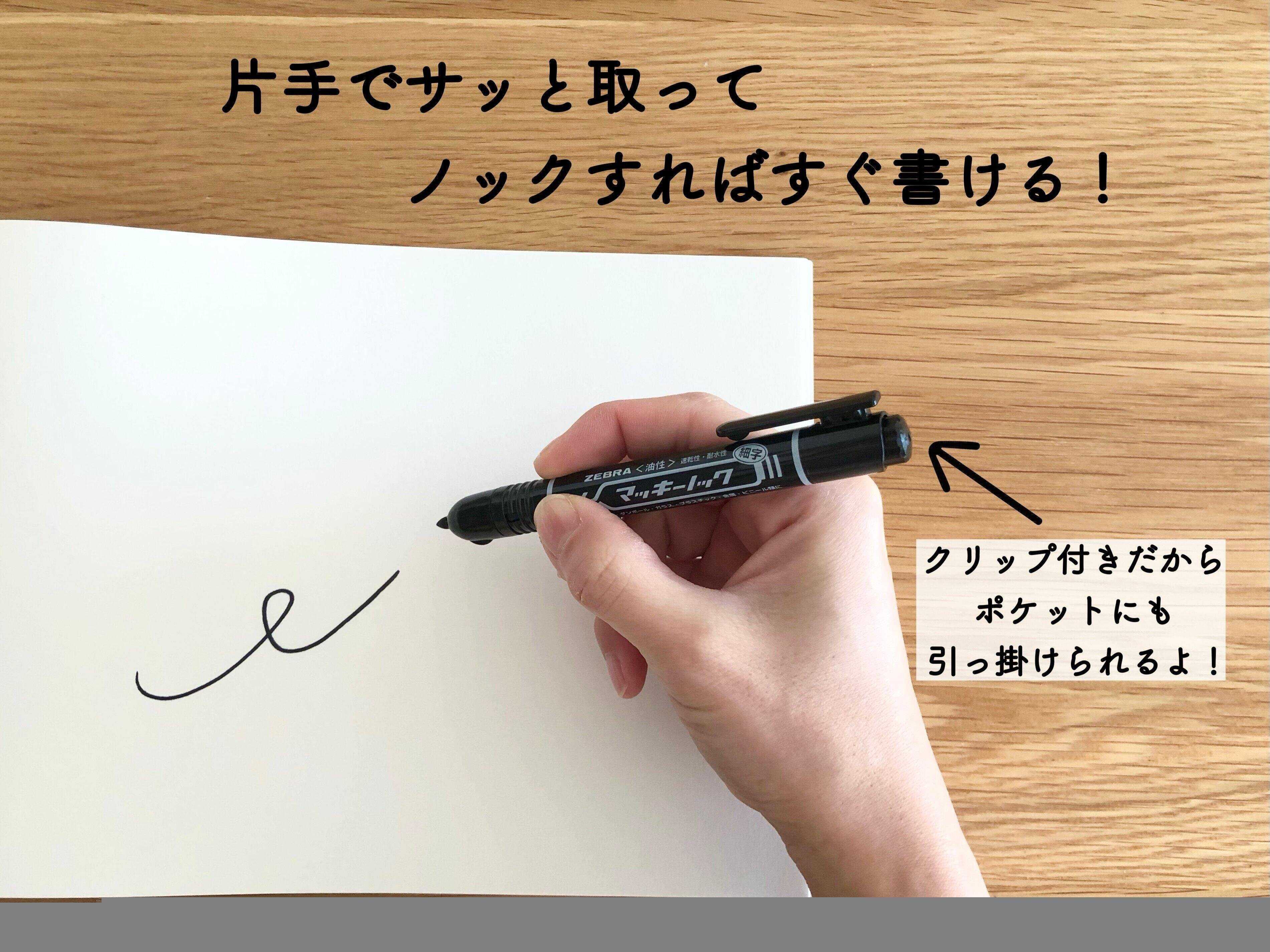 キャップ式だと、「キャップを外して」「キャップを無くさないように持って」「書いて」「キャップを閉める」という一連の動作をする必要があったんですが、ノック式はその必要が無いんです!