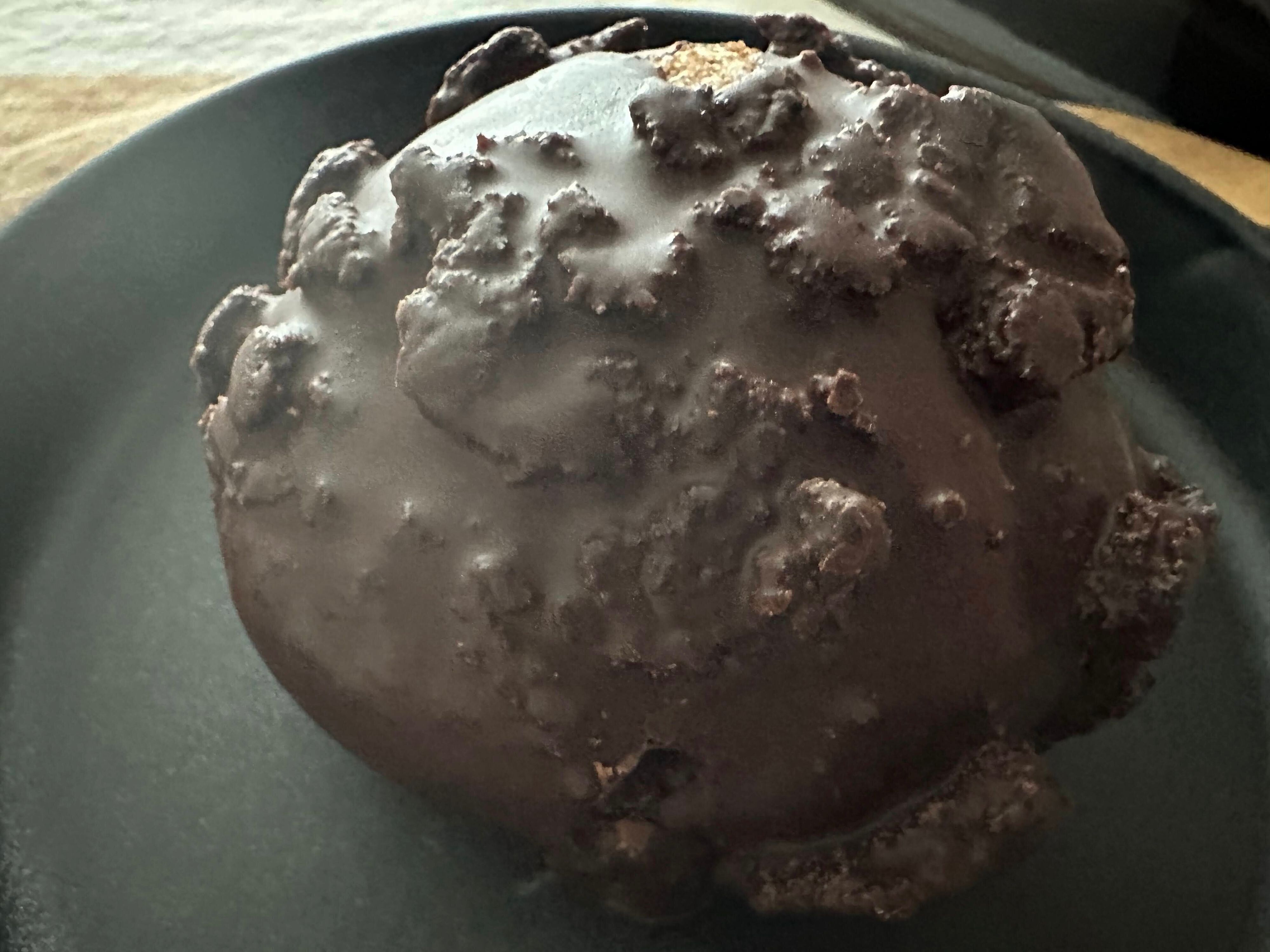 シュー生地にはザクザク食感の「ココアクッキー生地」と「ココアクランブル」がトッピングされており、さらにその上からシュー全体を覆うようにチョコレートがコーティングされています。