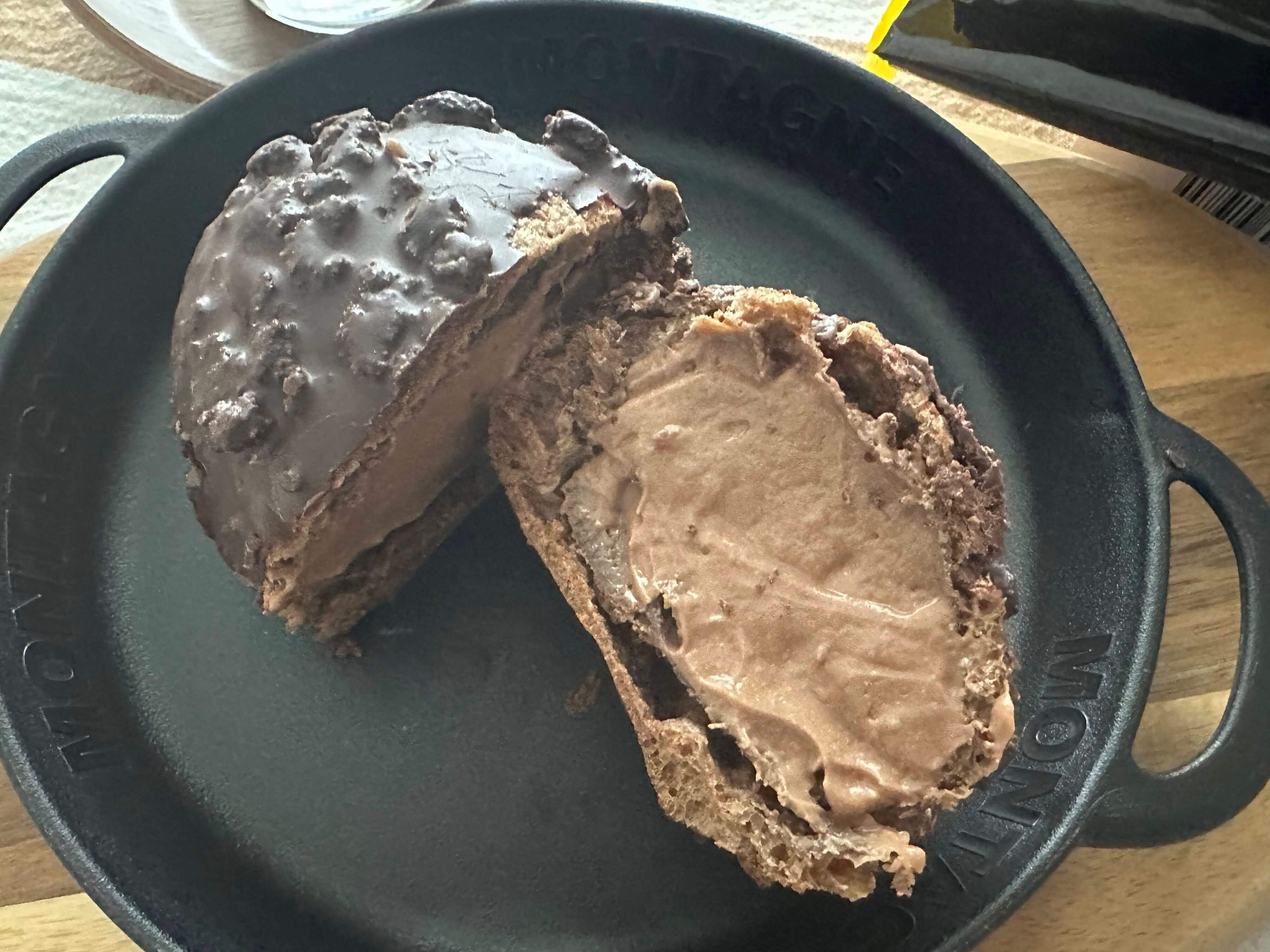 半分にカットしてみると、これでもかと言うほどたっぷりのチョコレートクリームが隙間なくギッシリとつまっています。トロトロチョコクリームはしっかり甘く、食べ進めていくうちにクリームがあふれ出す嬉しいハプニングが起こるほどのボリュームでしたよ。