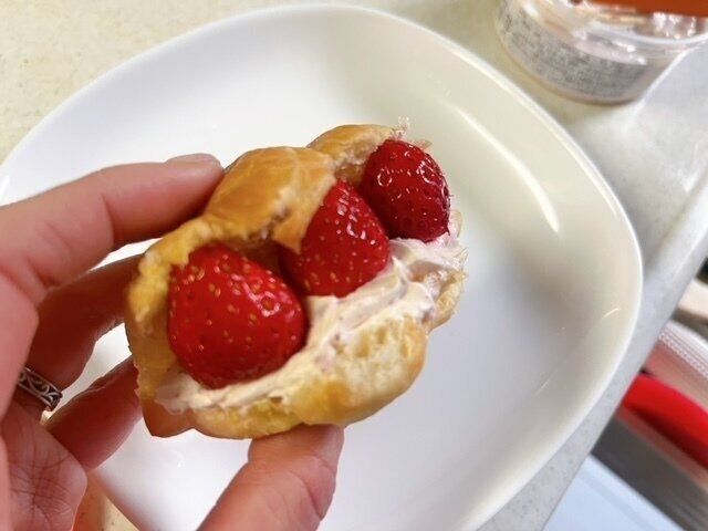 いちごホイップクリームの甘さと本物のいちごの甘酸っぱさがちょうど良く何個でも食べられるおいしさ。