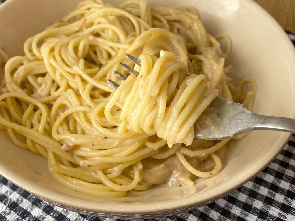 600wの電子レンジで1分10秒温めて、茹でたパスタにかけるだけで手軽に食べられます。ボテッとしたテクスチャーのソースはパスタとのからみもバッチリ。