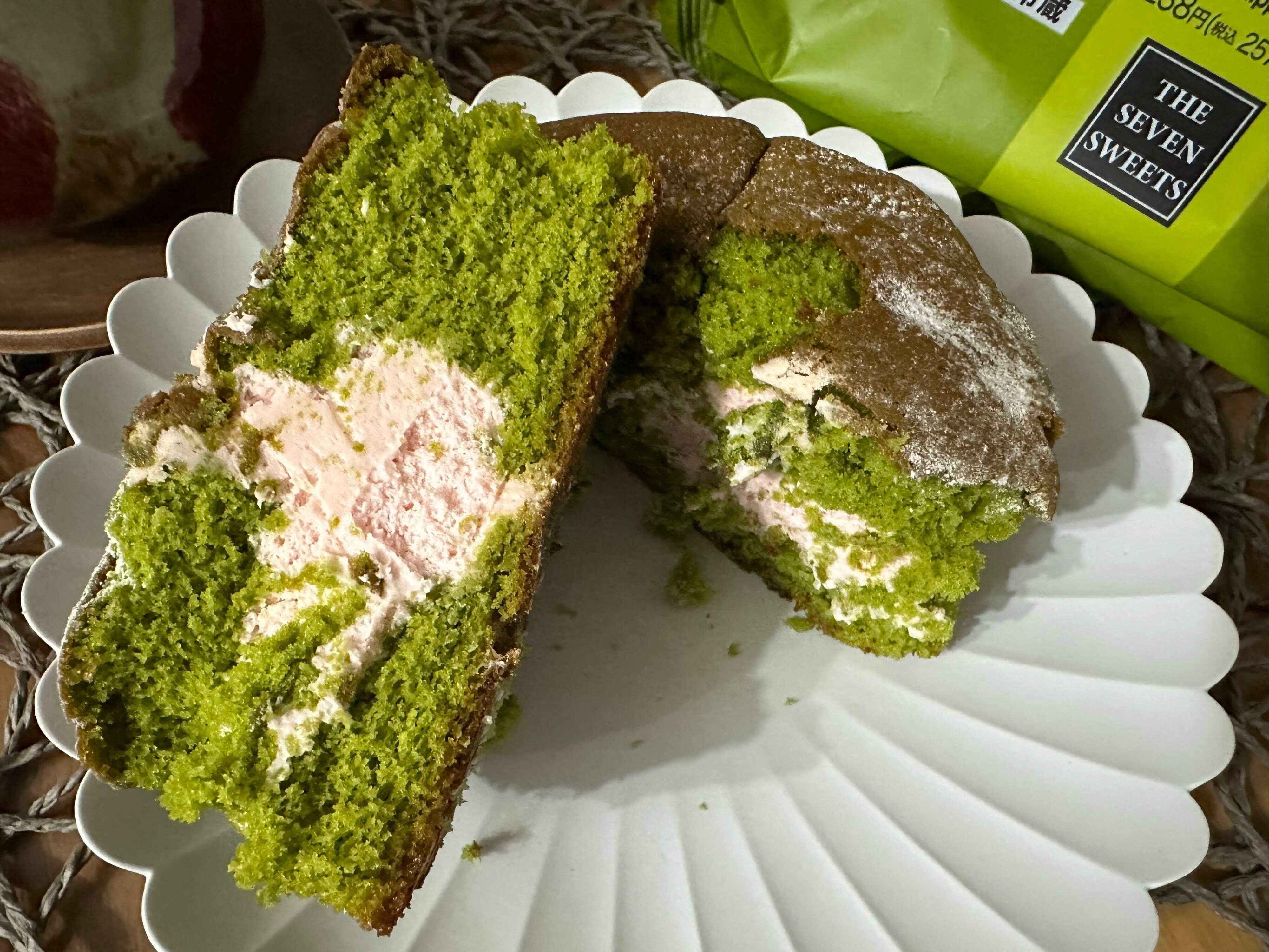 ふわふわのカステラを半分にカットしてみると淡いピンクがかわいらしい桜ホイップがお目見え。カステラの深いグリーンとホイップの淡いピンクのコントラストがなんとも美しい…!