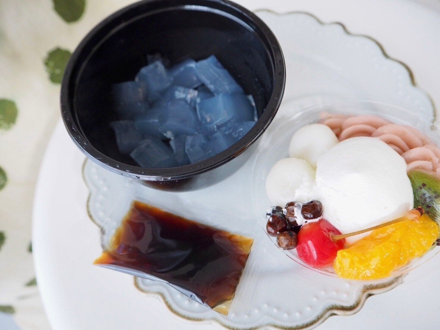 寒天の上にきれいに盛りつけを戻すのは至難の業ですが…スイーツを自分で作っている気分を味わえて楽しいです。