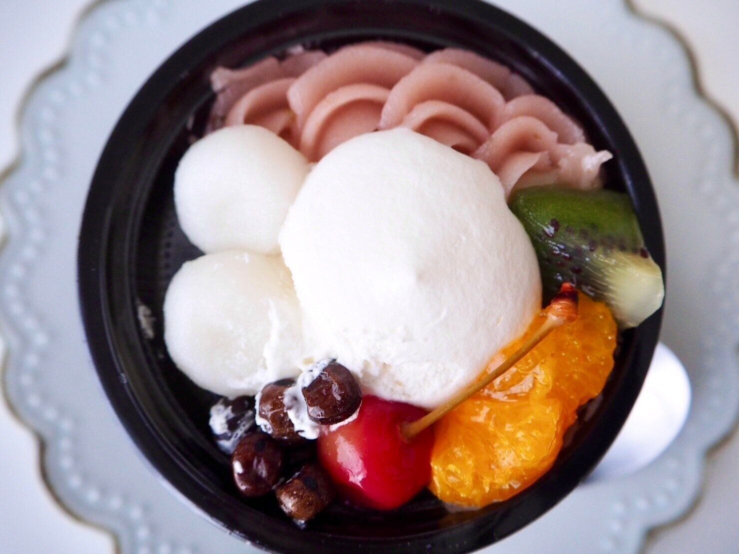 真ん中にたっぷりのホイップクリーム、そのまわりに、さくらんぼシロップ漬け、みかんシロップ漬け、キウイフルーツ、白玉、桜あん、塩豆が入っているカップスイーツです。