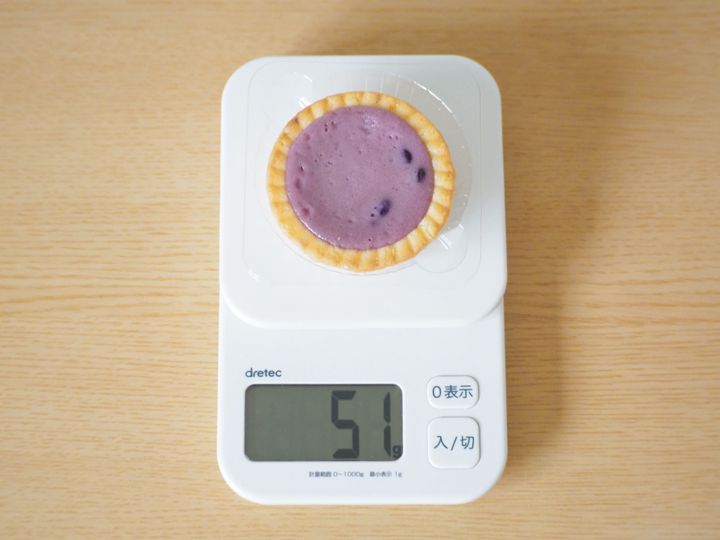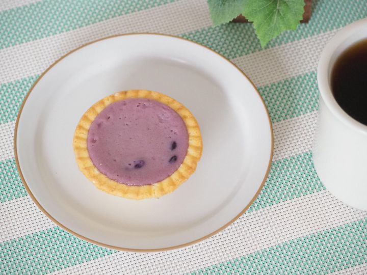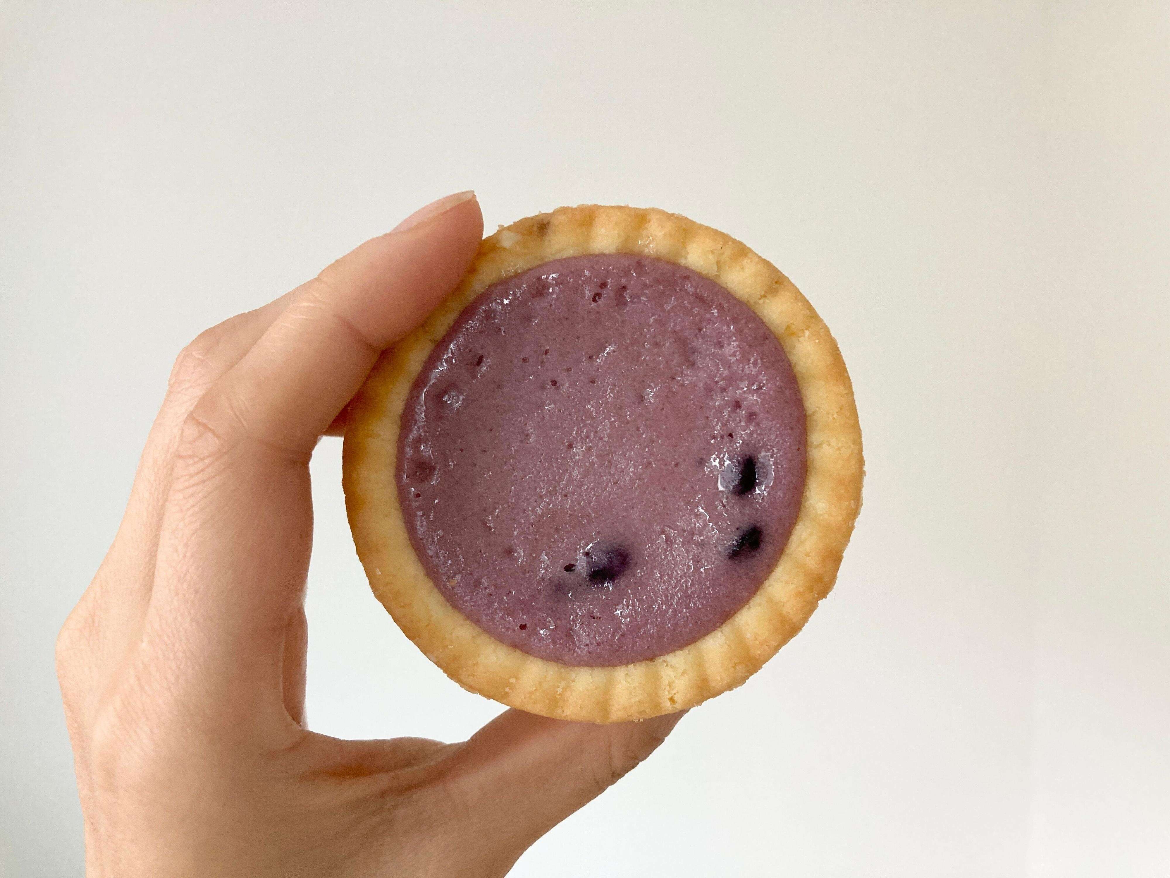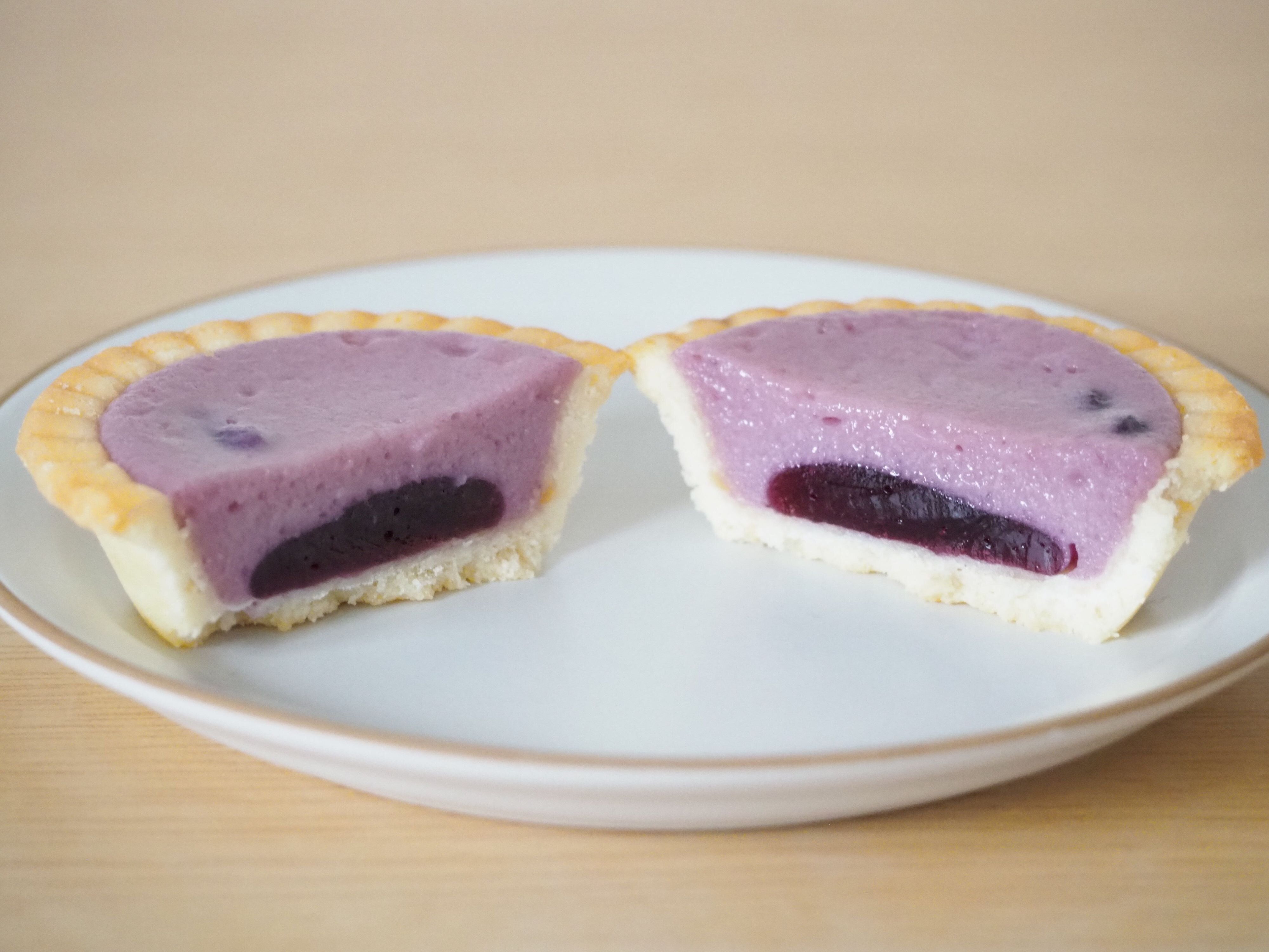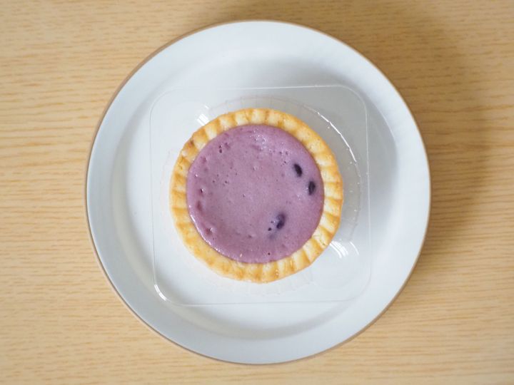 開封すると、紫色のタルトが登場。表面の一部にはブルーベリーの果肉が現れ、素材感のあるスイーツであることが読み取れます。