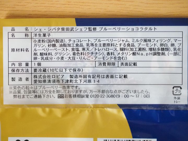 「シェ・シバタ柴田武シェフ監修ブルーベリーショコラタルト」は237.60円。冷蔵スイーツコーナーで見つけることができました。深みのあるブルーとゴールドを組み合わせたパッケージからは、高級感が漂っていますね。