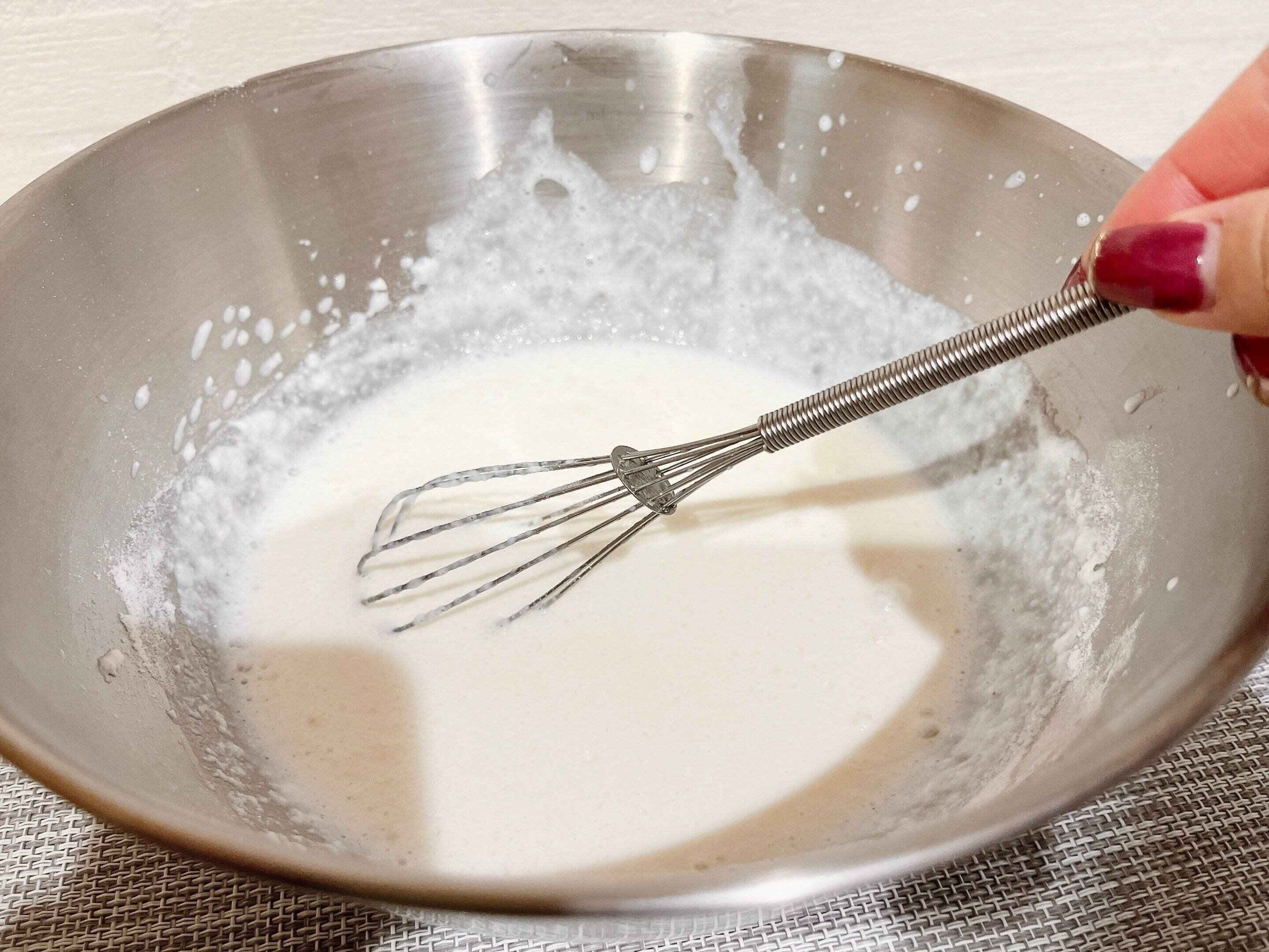 牛乳をボウルに入れ、泡立て器で約1分間泡立てます。