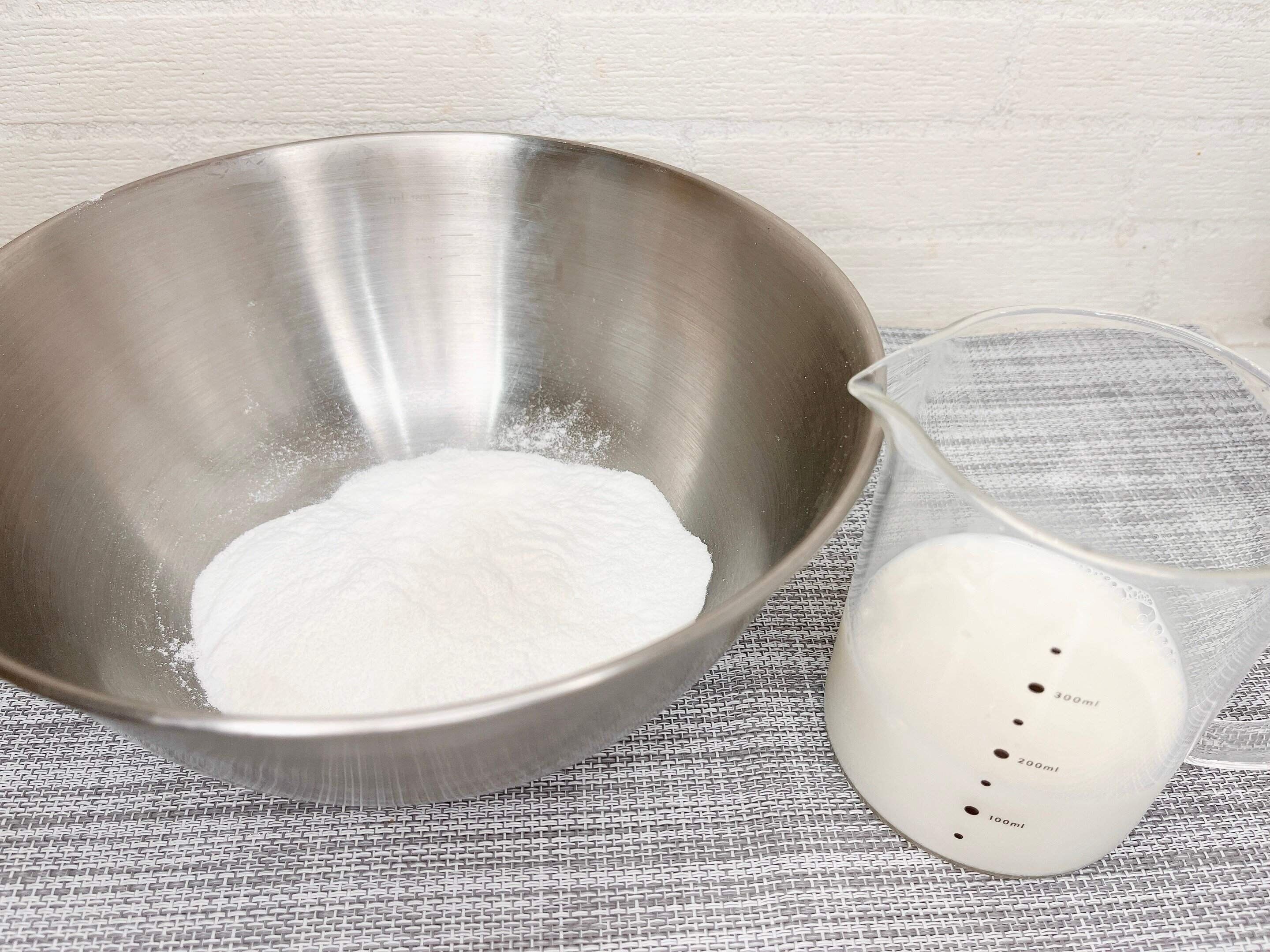 ボウルに本品1袋(50g)と冷たい牛乳(150ml)を用意します。