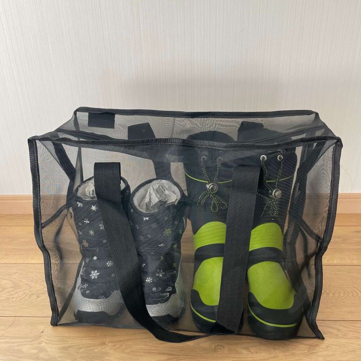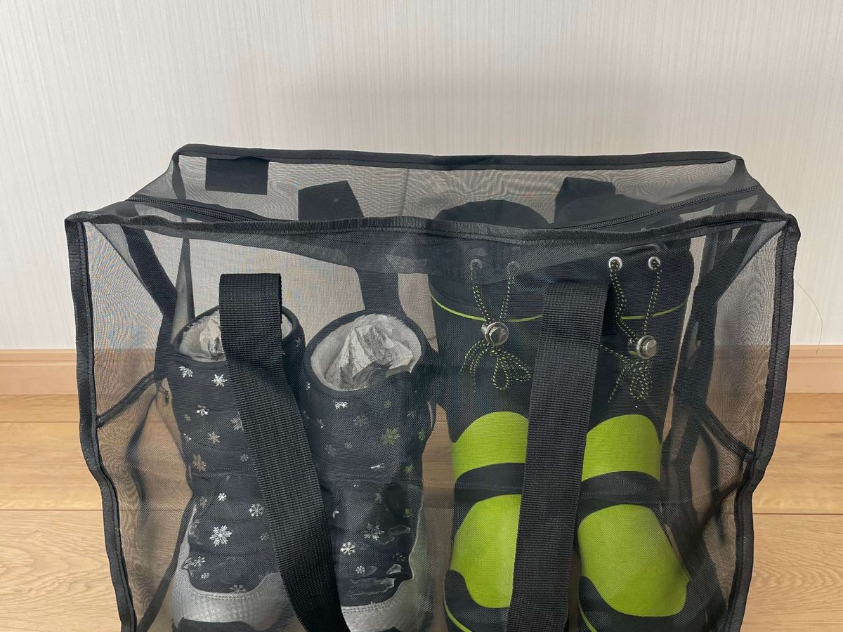 メッシュバッグのマチは20cmですが、柔らかい素材なので22cmの息子のブーツも横並びで入れることができました。