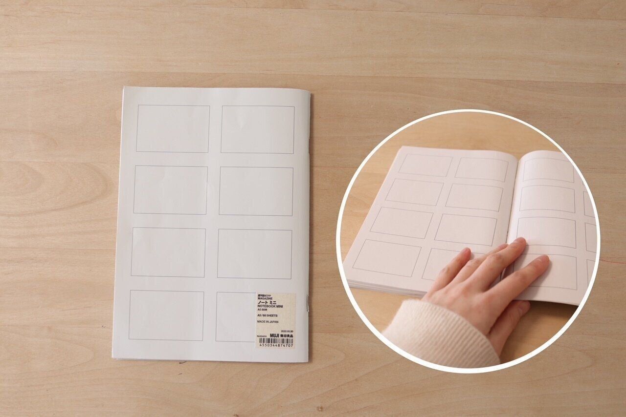 大きさと枚数は、A5・88枚。金額は税込150円。1ページ8つの四角い枠があるので、アイデアをまとめておくのにぴったり!漫画の4コマのように使うのもよし。Instagramなどの投稿づくりにも助かるアイテムです。実際にサンキュ!STYLEライターの記事やInstagramなどの投稿づくりで私はこのノートを利用しています。また、パワーポイントなどの資料作成の骨組みをつくる時にも役立ちましたよ~!
