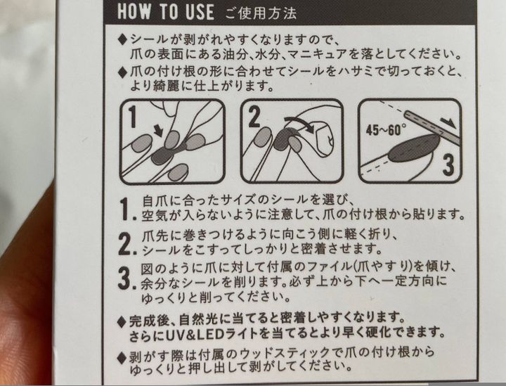 このネイルシールには、「1週間以上の長期利用はしないでください」の注意書きがあります。ジェルネイルにしては短いですが、ライトがなくても貼るだけでデザイン性のあるジェルネイルが楽しめる便利な商品。イベントの時期だけネイルをしたいという人にぴったりのアイテムですよ。