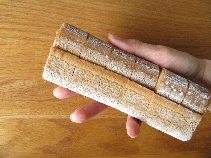 こちら、1切れの厚みが2.5センチ強あるので、6切れで15センチを超える計算なのですね。魚の切り身に引けを取らない長さです。