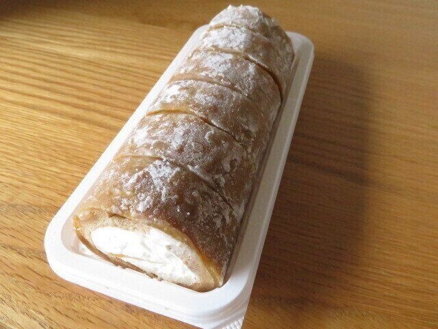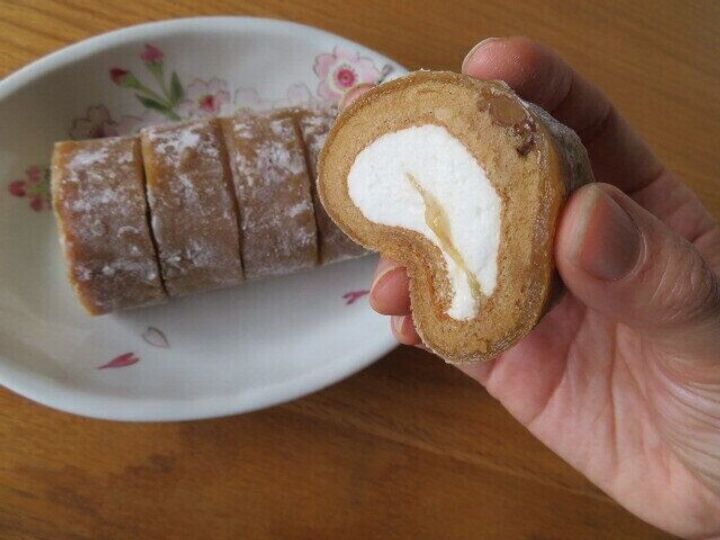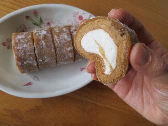 皿に移す時、興味本位でひっくり返してみたら、ちゃんとロールケーキらしい形状が確認できました。