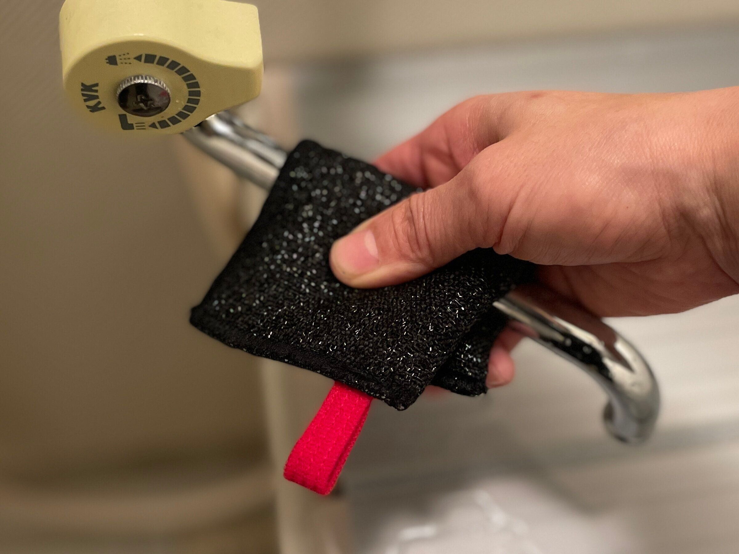 普通のスポンジよりも力が入りやすく、水あかをこすり落とせるから使いやすい!汚れをよく落としてくれますよ。