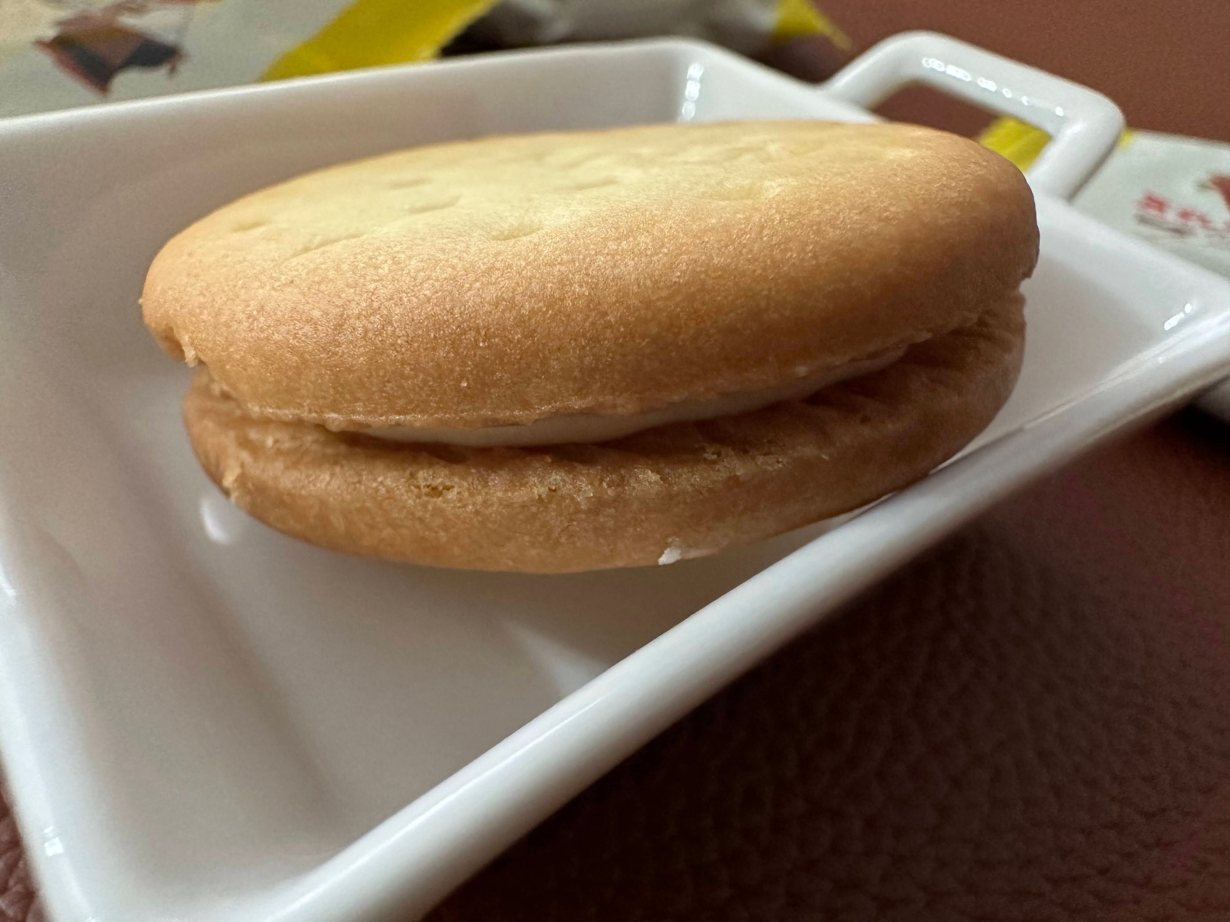 豆乳入りのサクサク軽い食感のビスケット生地はしっかり厚みがあって食べ応え抜群。ビスケットの間にサンドされたあま〜いプリン風味クリームも最高に美味。
