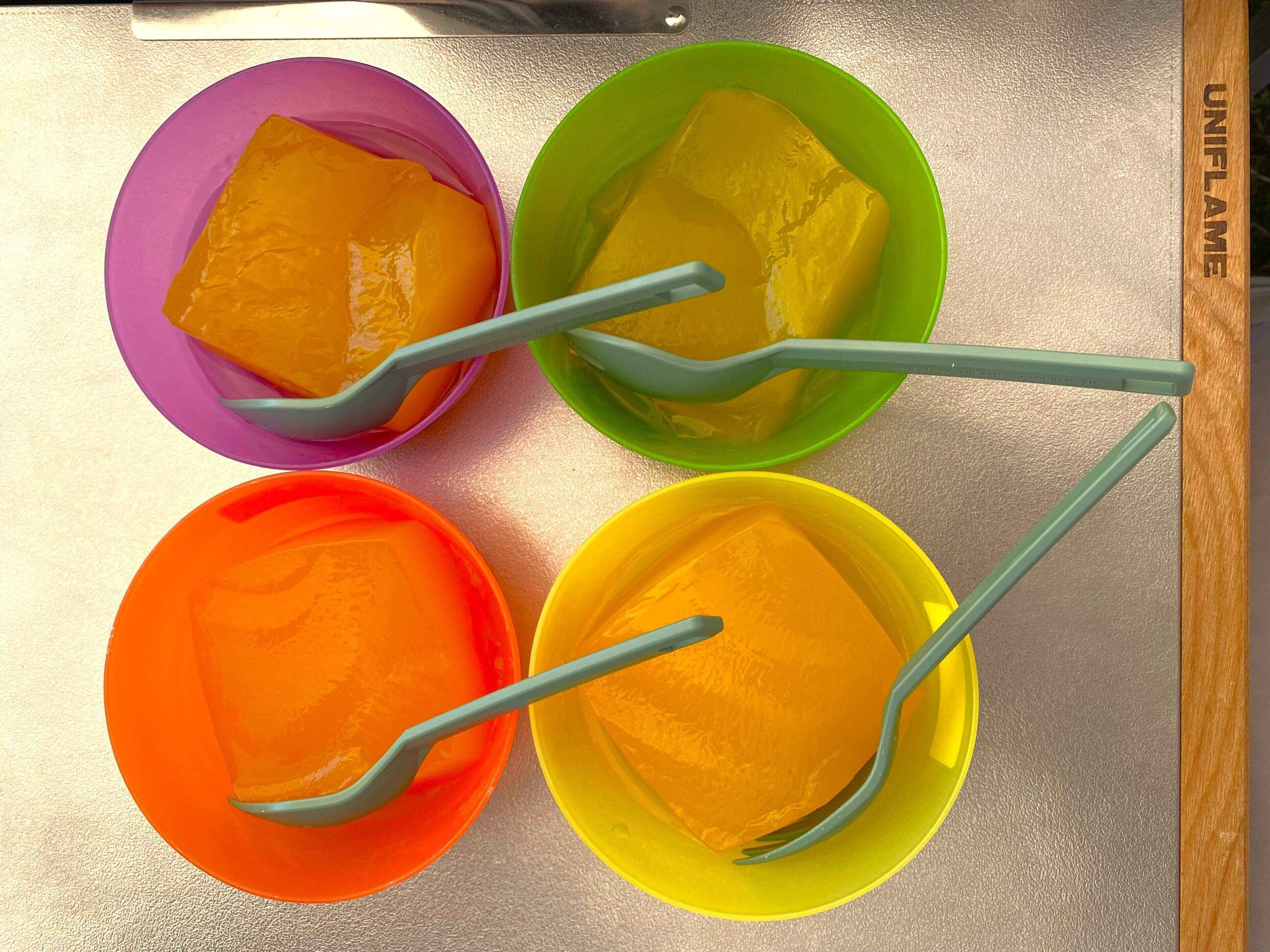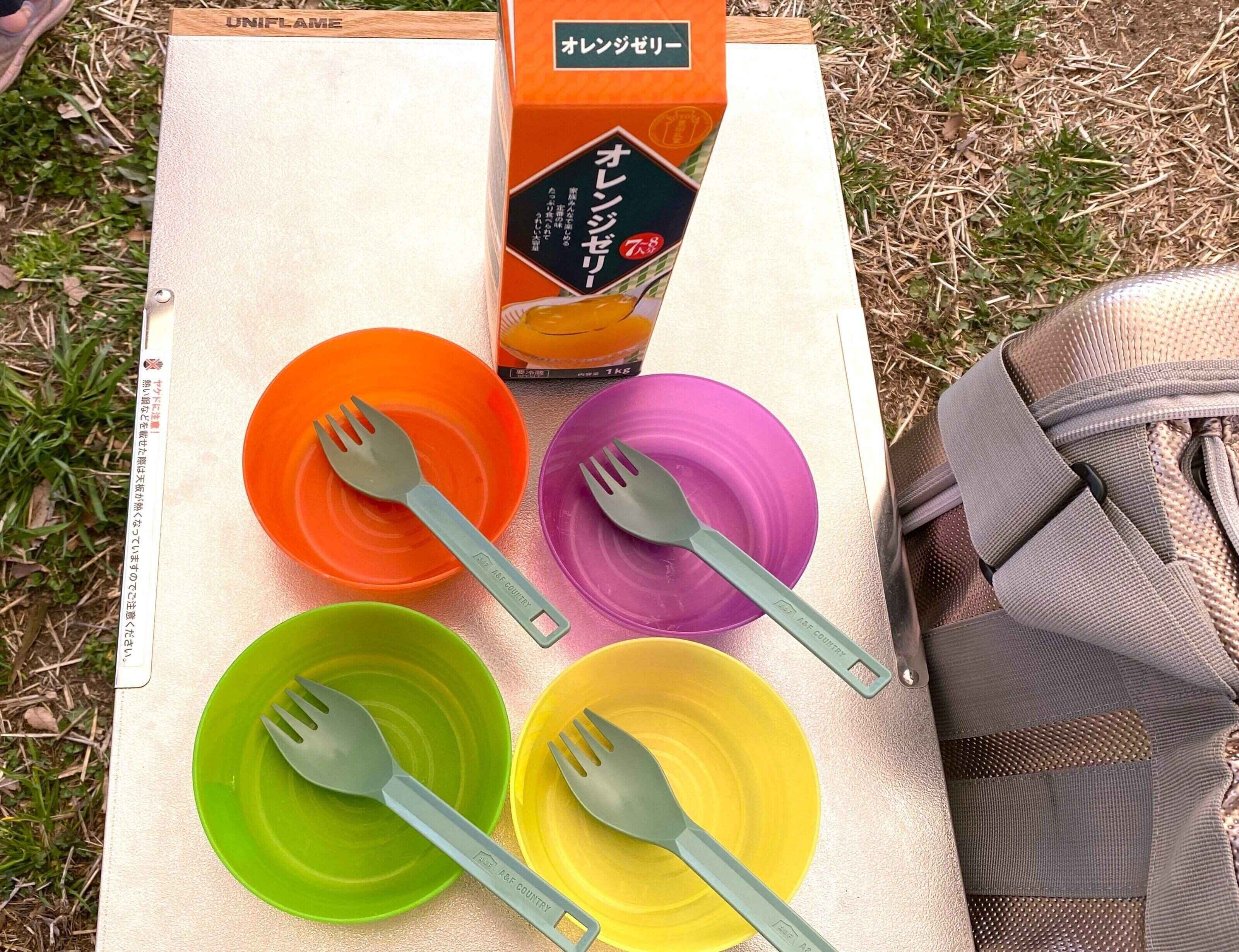 お外で食べる時は、深さのあるお皿を用意します。(浅いお皿はこぼしやすいのでおすすめしません。)お皿を並べて、紙パックゼリーを手に持ちスプーンで切りながらお皿に入れていきます。