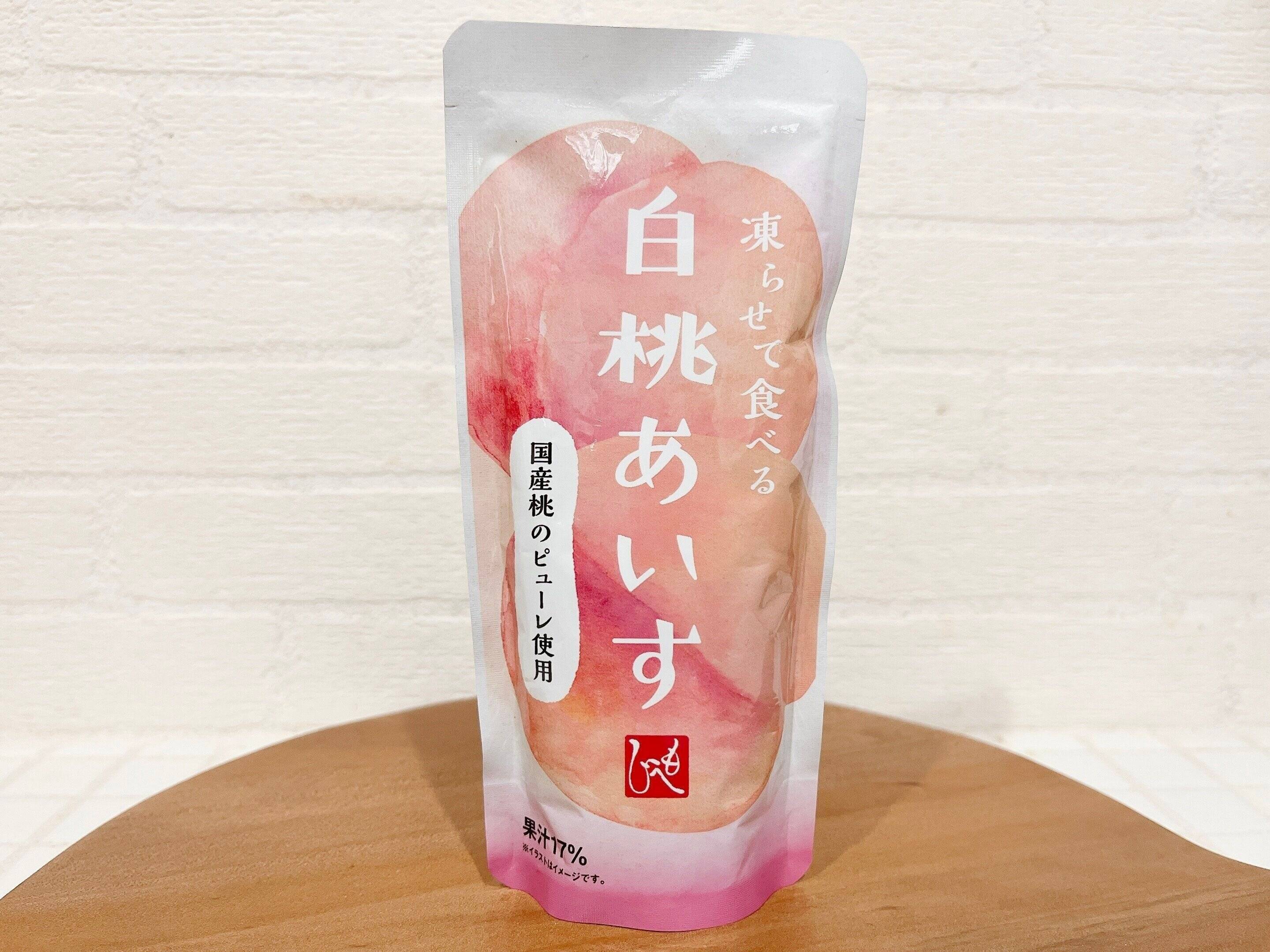 『国産の白桃ピューレを使用した、凍らせて食べるあいすです。少ししっとりとした食感で桃の果実感をあじわえます。少し振って袋のまま凍らせてお召し上がりください。お酒や炭酸水に入れても』(HPより)