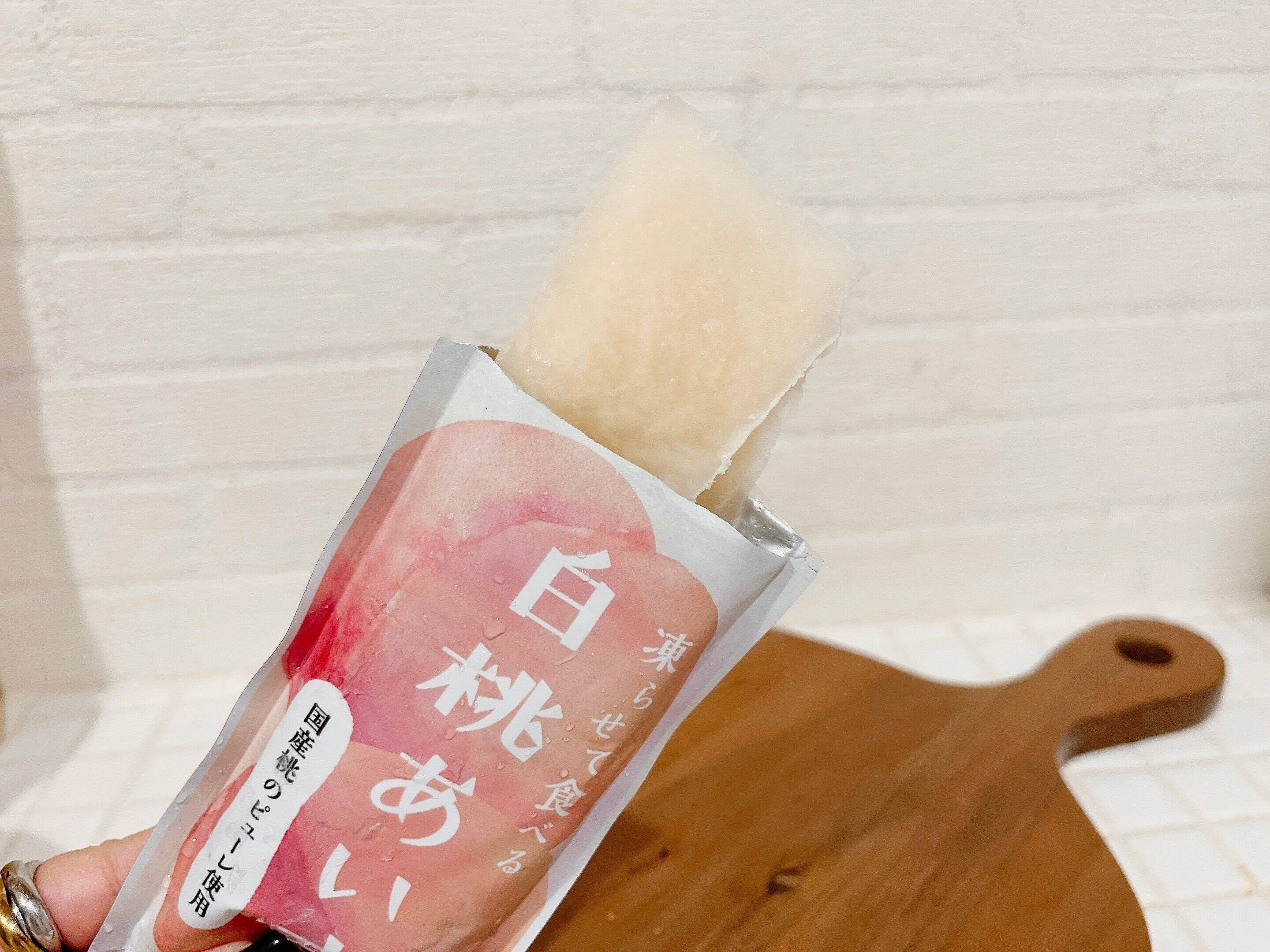 白桃のアイスなのでシャリシャリのシャーベット状を想像していましたが、一口食べてびっくり、しっとりした食感でやわらかい~!さらに、桃感が強くジューシーな味わい。