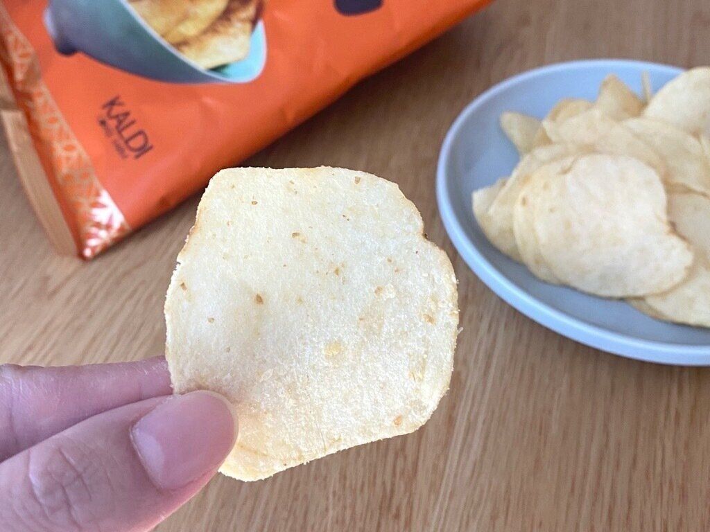 パリパリと軽い食感のチップスはしっかりとじゃがいもの味があり、濃いめのからすみ味とよく合っています。ほんのりエビの風味も香りクセになる味わい。これはビールや日本酒に合わせるとお酒が進むこと間違いなし。