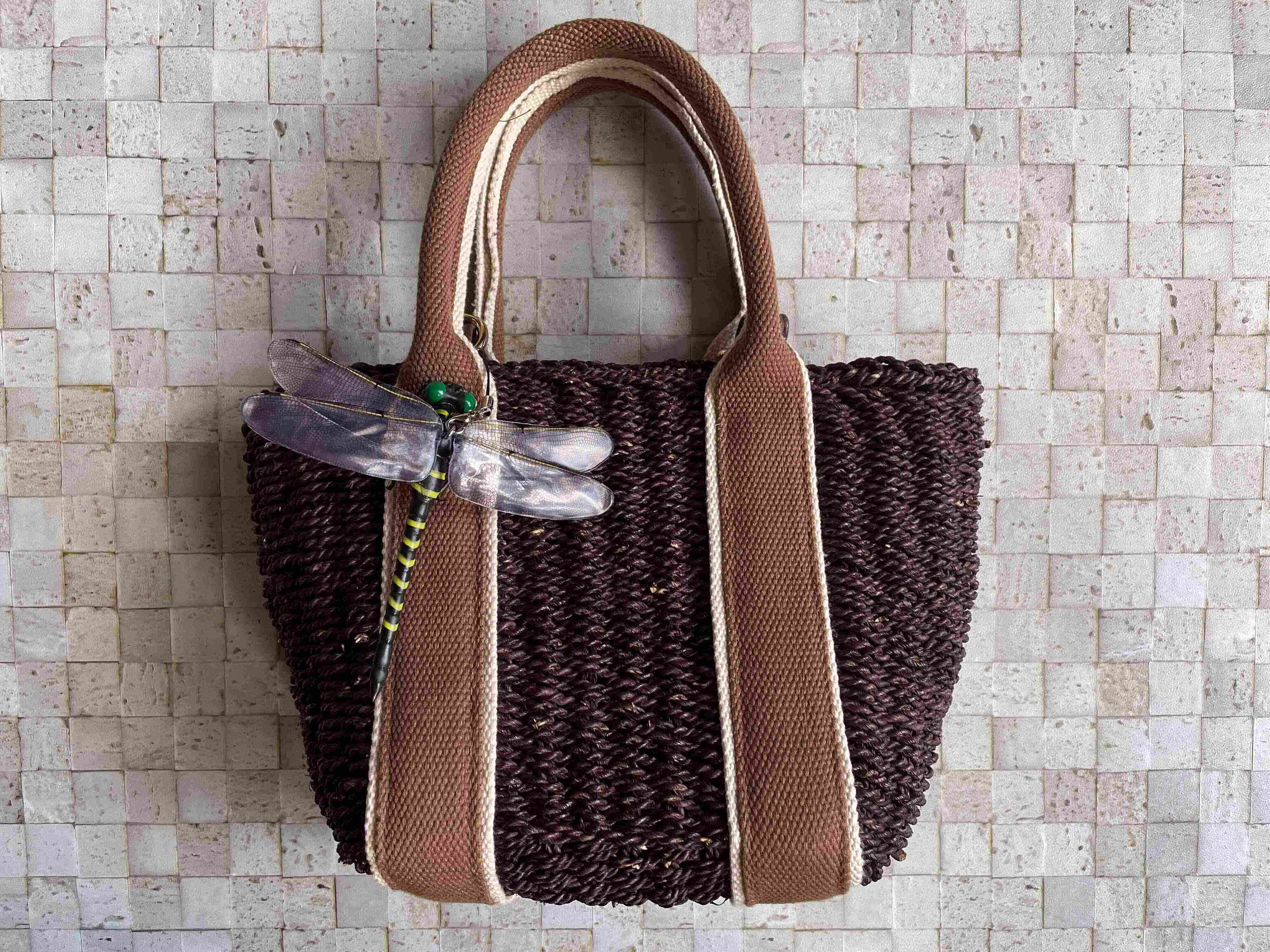 ためしに自分のカゴバッグにつけてみました。奇抜な感じになるかな?と思いましたが、アレ?意外と変じゃない?