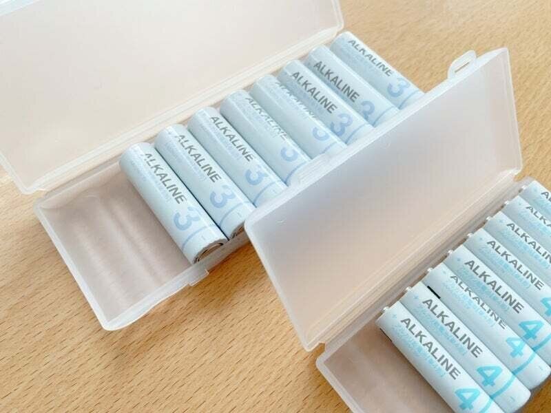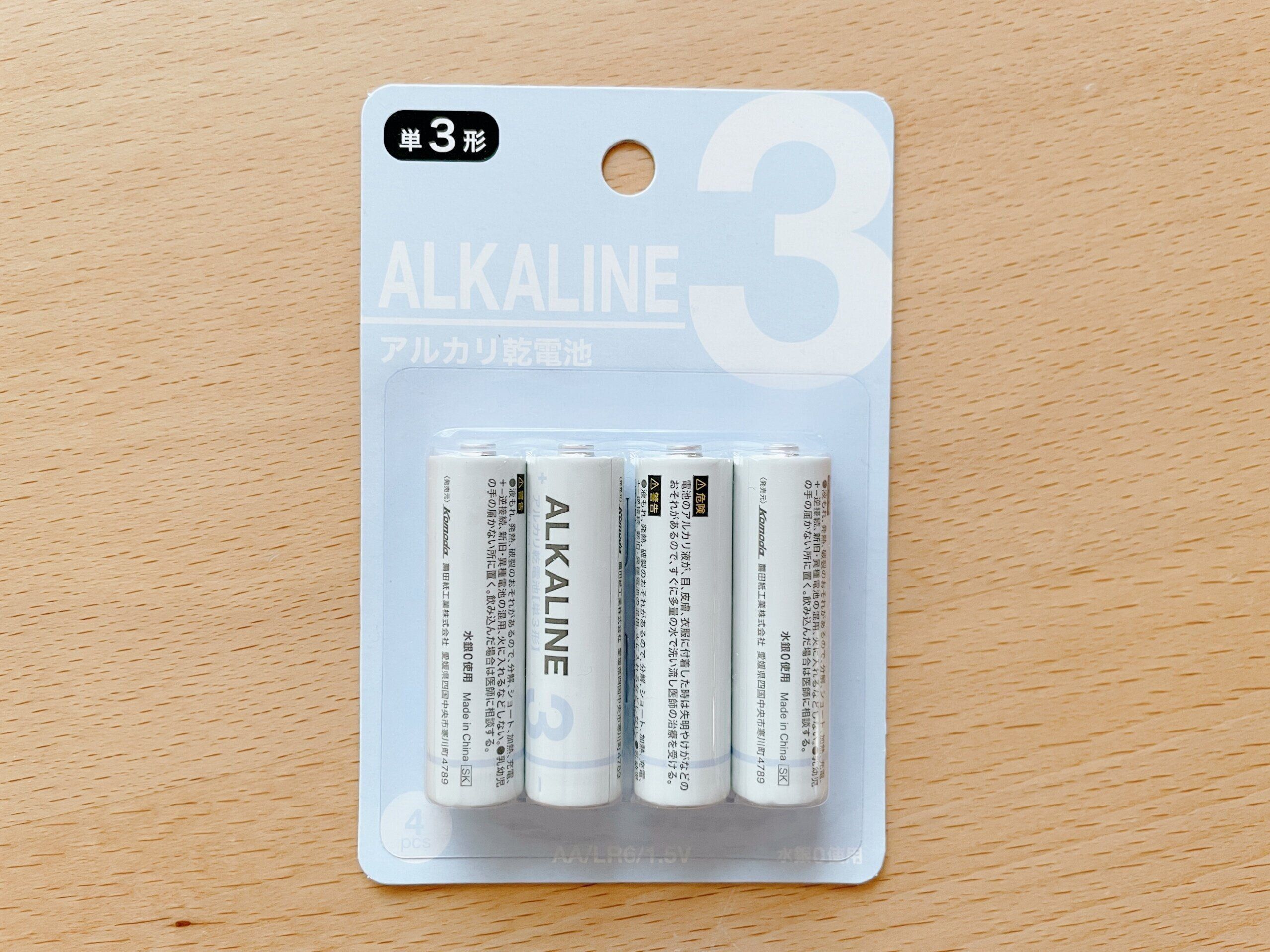 見た目がとってもシンプルで素敵なアルカリ電池(単3電池 4本入り 110円)。わが家では単2、単3、単4電池を購入してストックしています。これが今私が知る中で一番見た目が好みの電池!