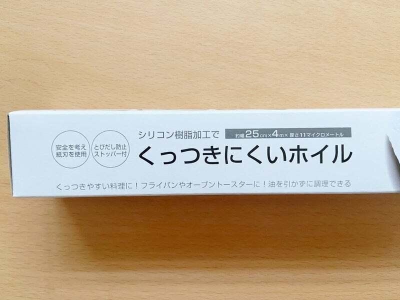 シリコン樹脂加工でフライパンに置くと油を引かずに調理できる便利アイテムの「くっつきにくいホイル(110円)」。25cm x 4mで、1回30cm使用と考えるとコスパは8.3円/回。このホイルは特に時間のない朝調理に使っています。