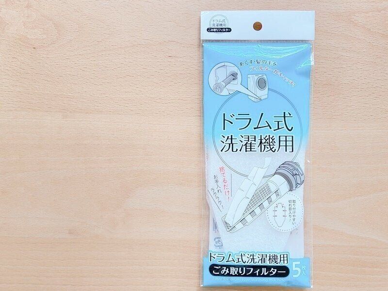 ドラム式洗濯機の排水フィルター本体にセットすれば、ゴミが溜まったらポイっと捨てるだけで楽ちんな「ドラム式洗濯機用ごみ取りフィルター(5枚入り 110円)」。