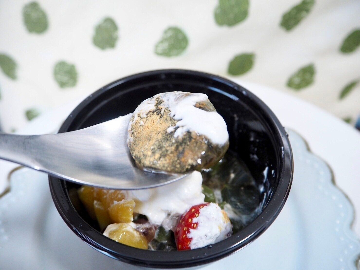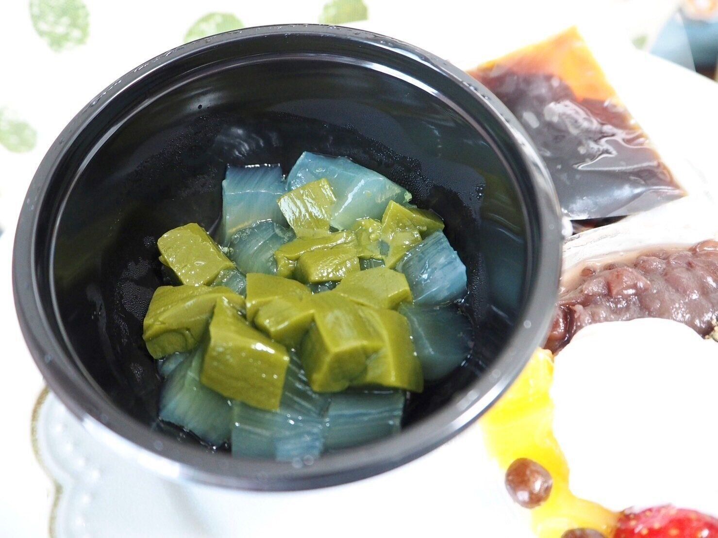 ケースが2段に分かれており、下の段には寒天と抹茶の寒天、黒蜜が入っており、その上にトッピングを自分でのせることであんみつが完成します。