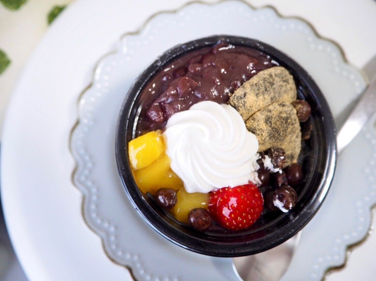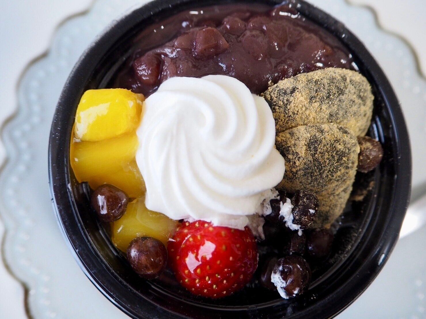 1つのカップの中に、抹茶わらび餅、シロップ漬けのマンゴー、苺、ホイップクリーム、粒あん、塩豆が入ったあんみつです。